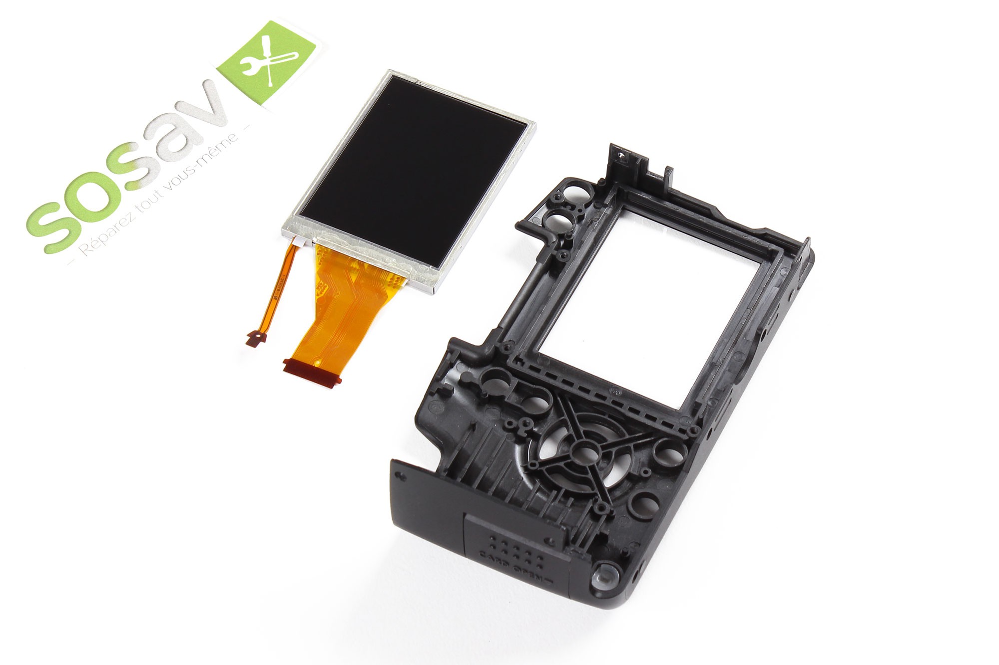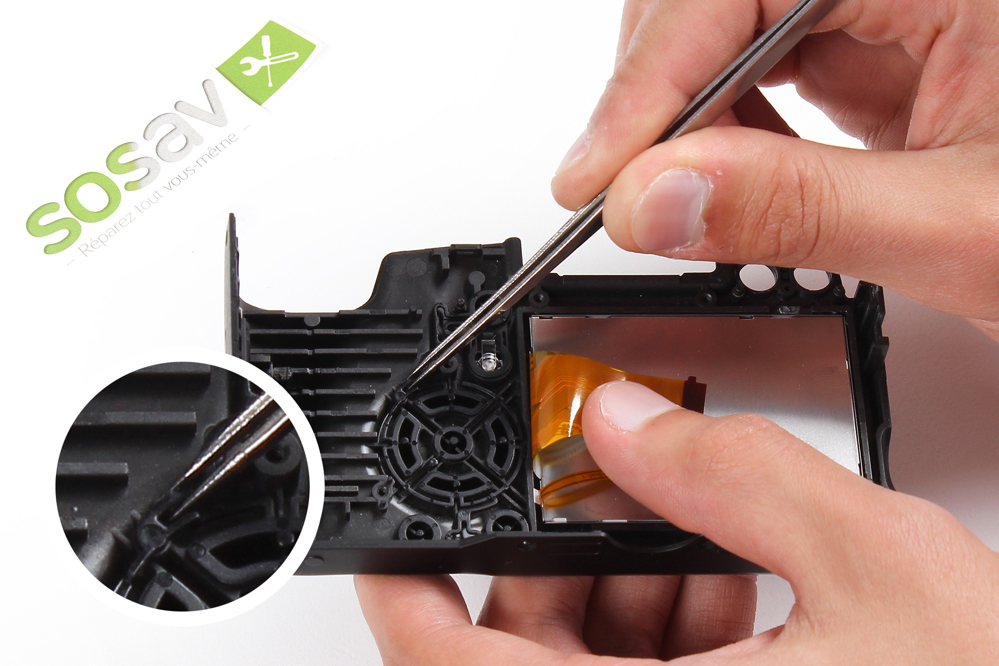 Saisissez l'appareil puis soulevez très délicatement par la gauche la façade avant afin de la déclipser du reste de l'appareil.N'essayez pas d'ôter totalement la façade à cette étape ! Une nappe relie la façade avant au reste de l'appareil photo.