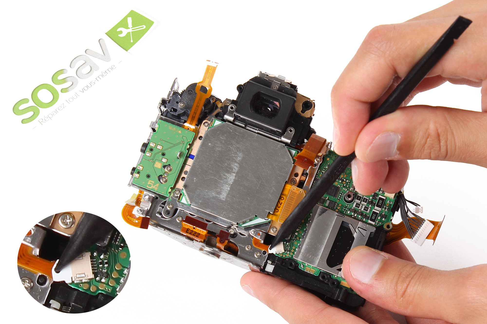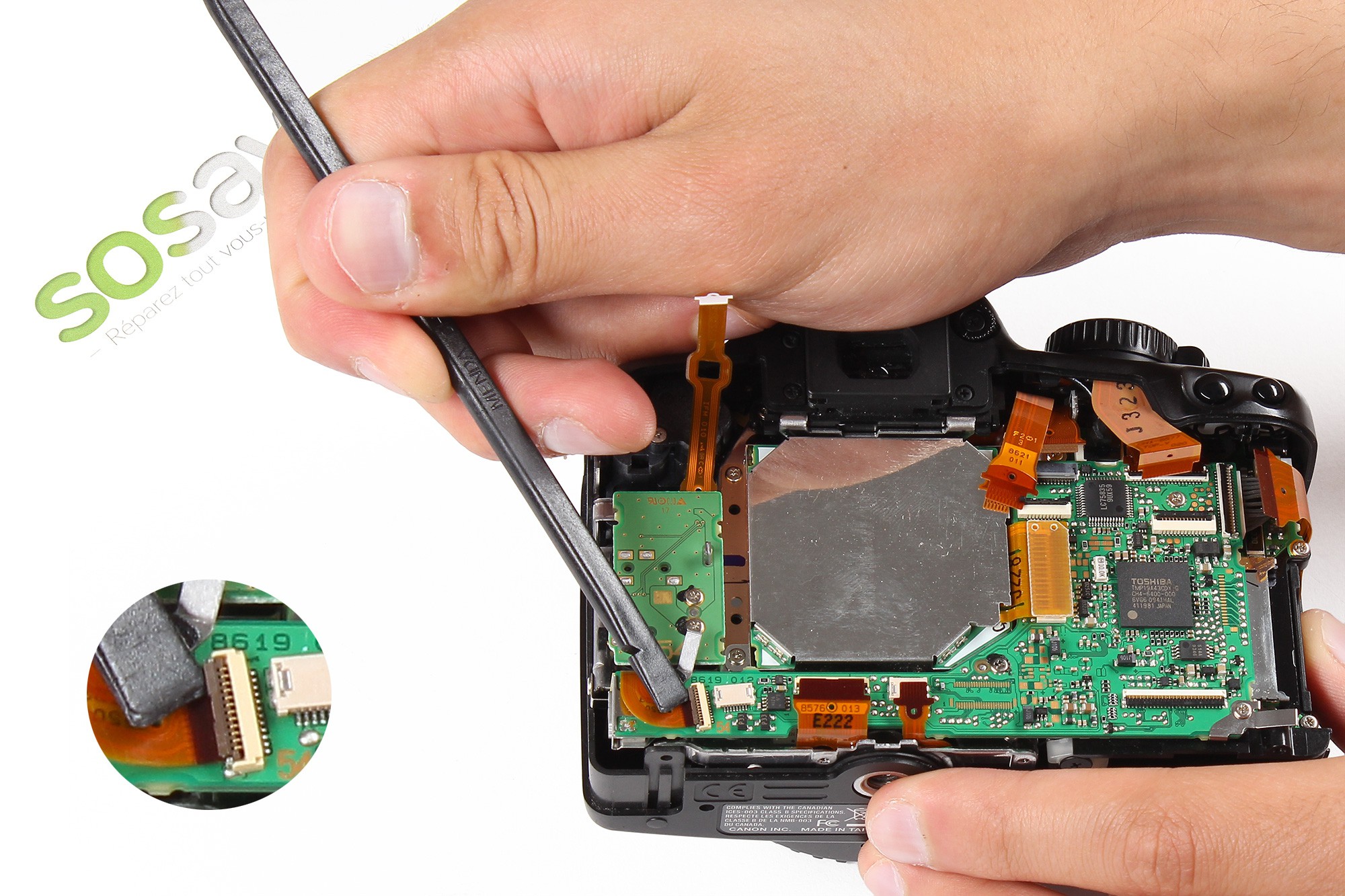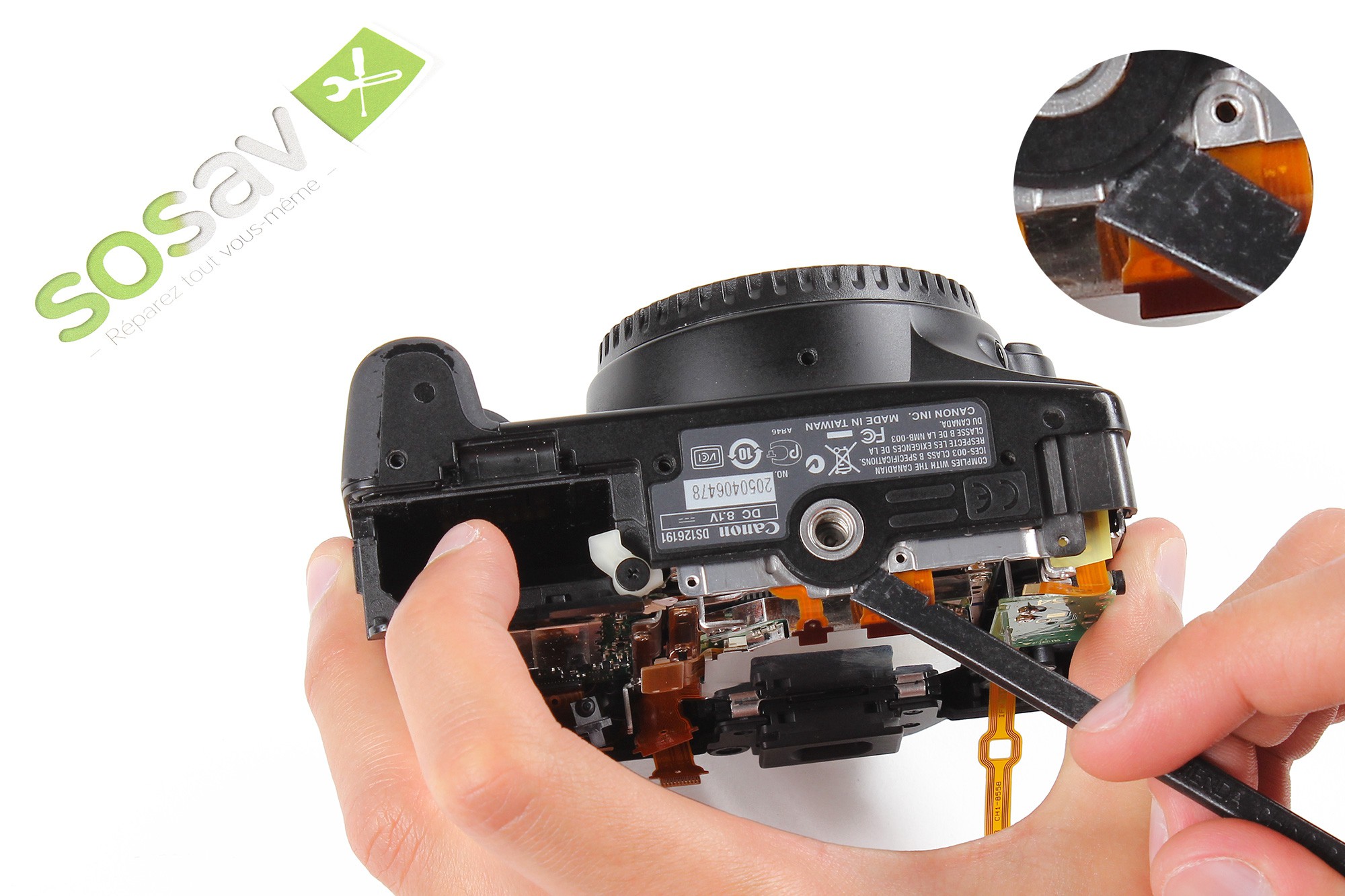 Utilisez la pointe de la spatule en nylon afin de retirer la nappe de liaison des boutons/connecteur de l'objectif.