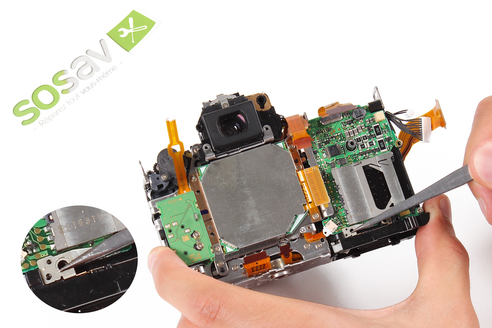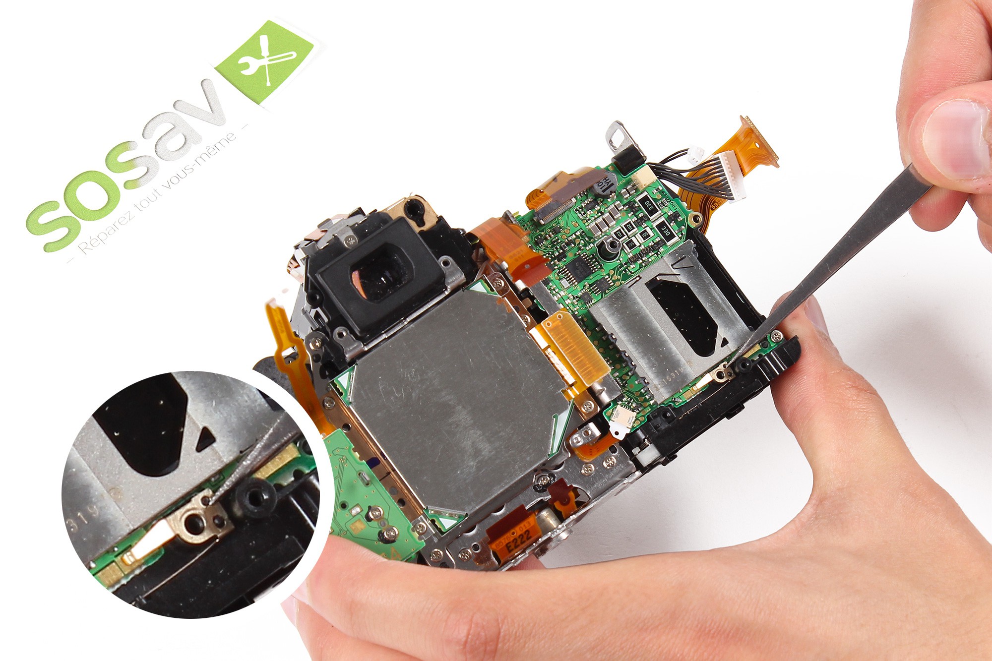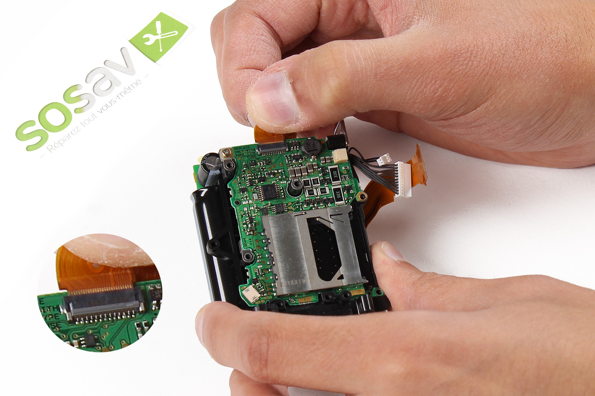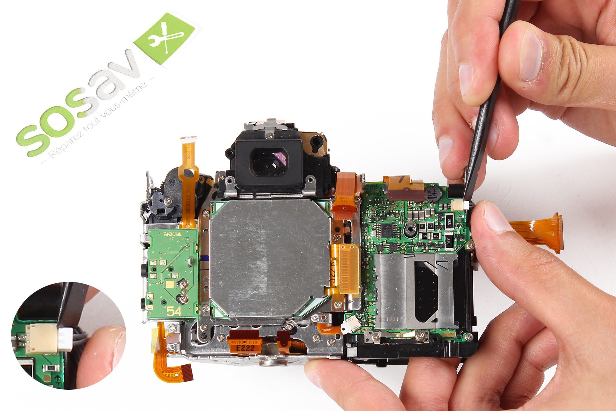 Utilisez la pointe de la spatule en nylon afin de retirer la nappe de liaison des boutons/connecteur de l'objectif.
