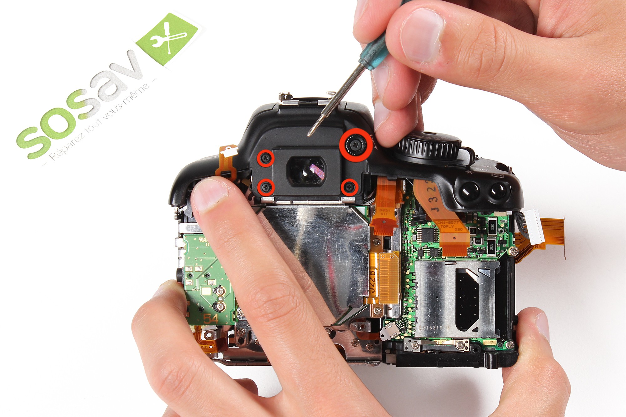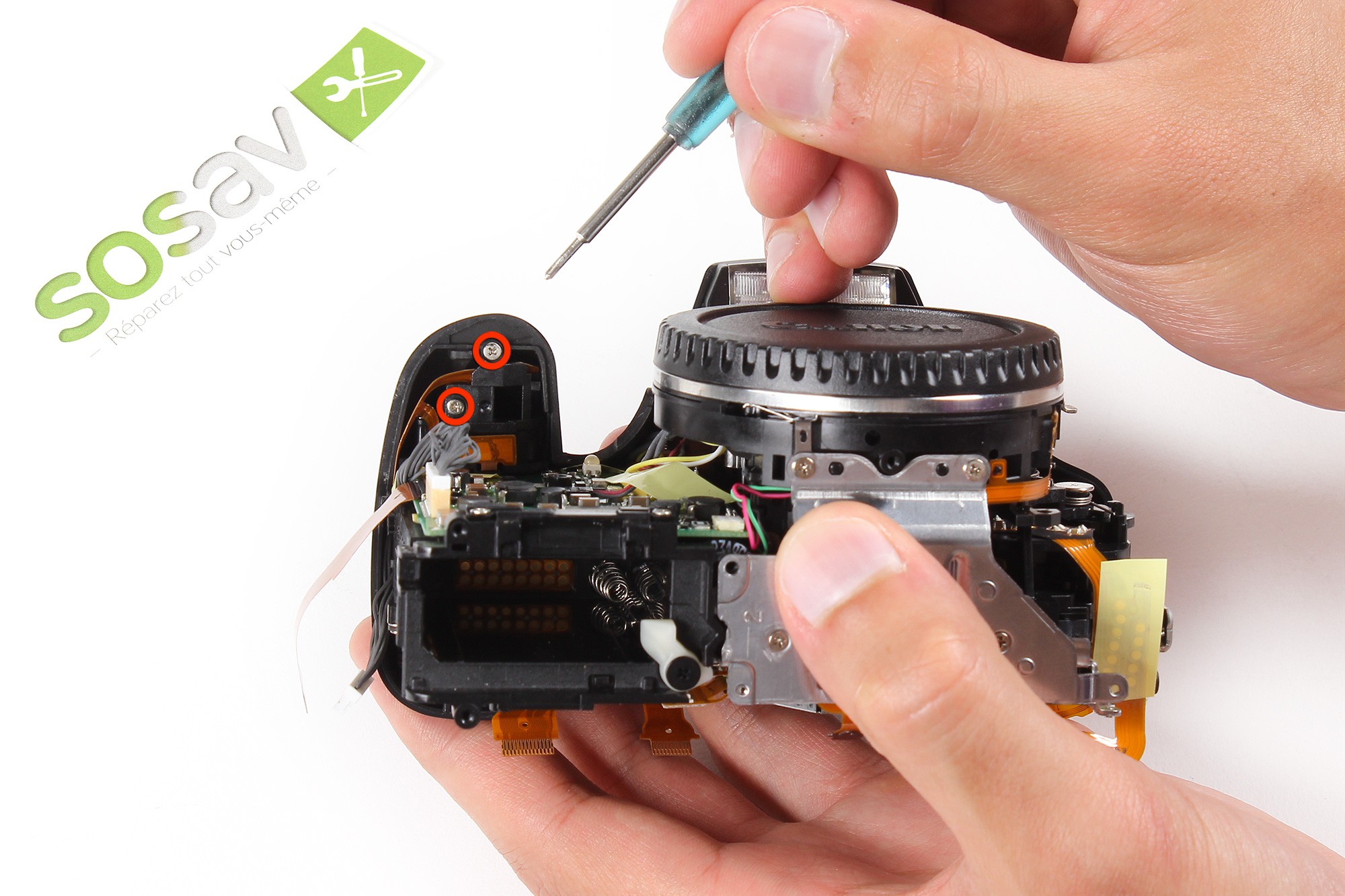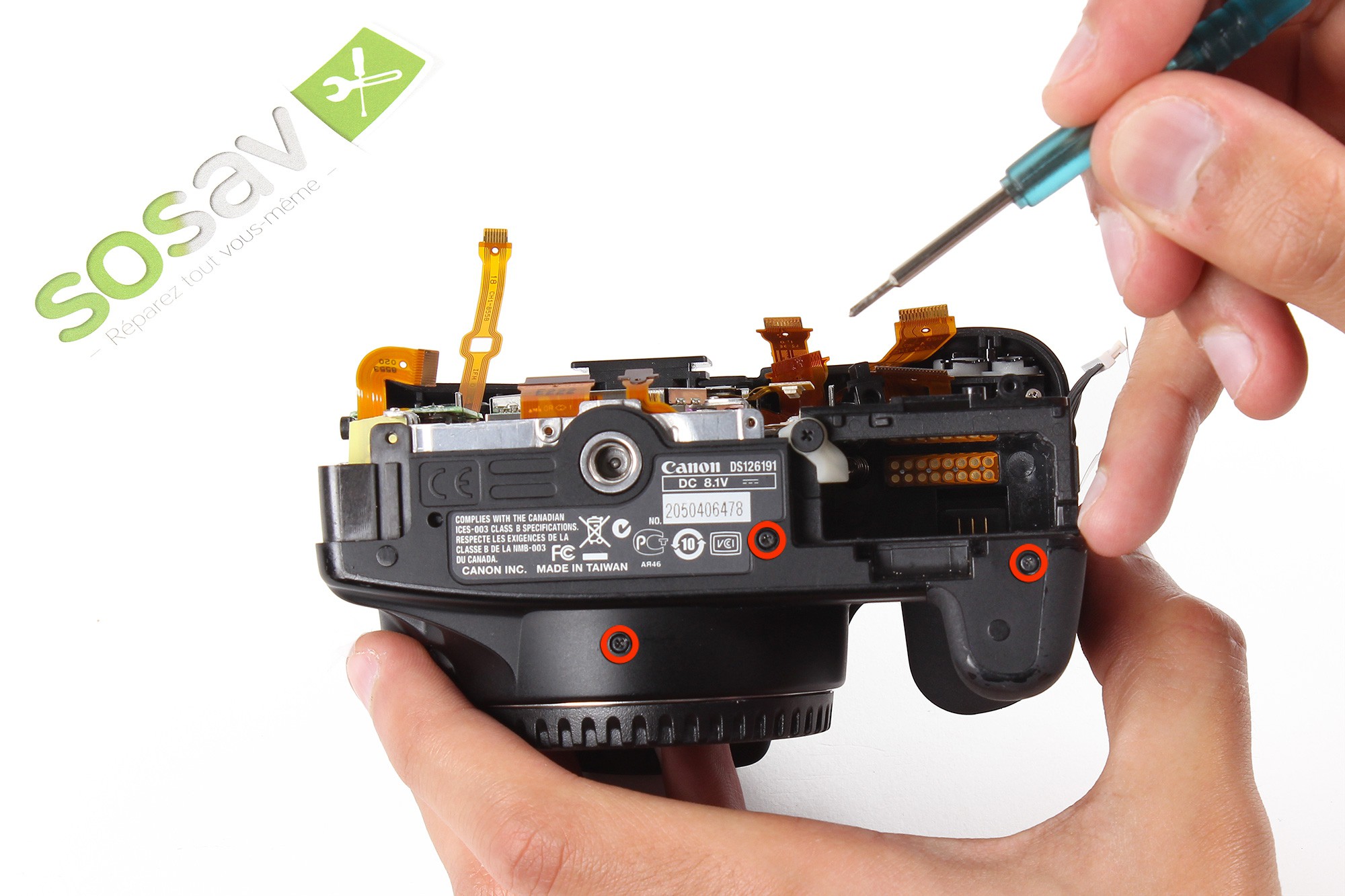 A l'aide d'un tournevis cruciforme, dévissez les trois vis entourées en rouge.Ces vis servent à maintenir la coque avant de l'appareil photo.