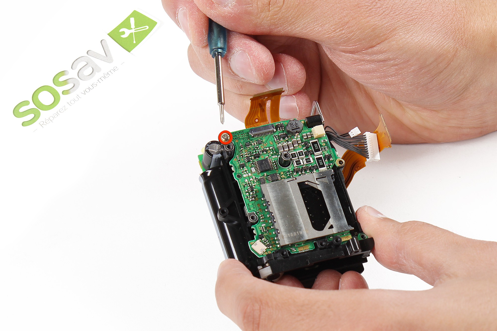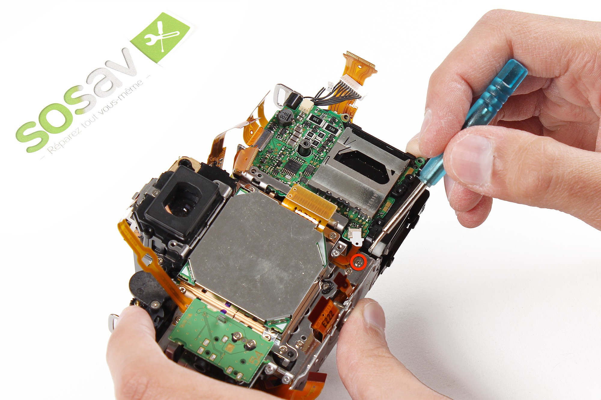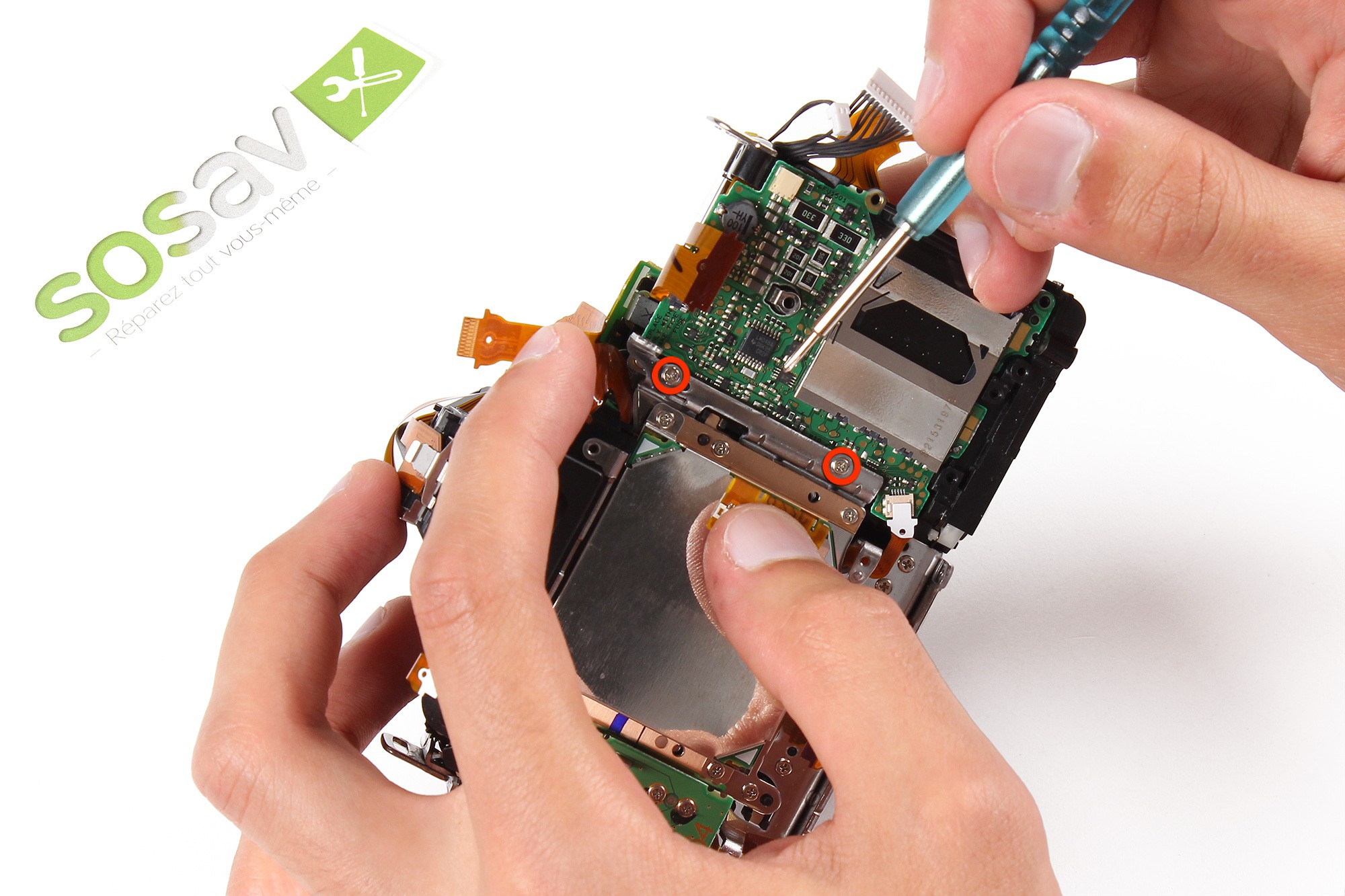A l'aide d'un tournevis cruciforme, dévissez les trois vis entourées en rouge.Ces vis servent à maintenir la coque avant de l'appareil photo.