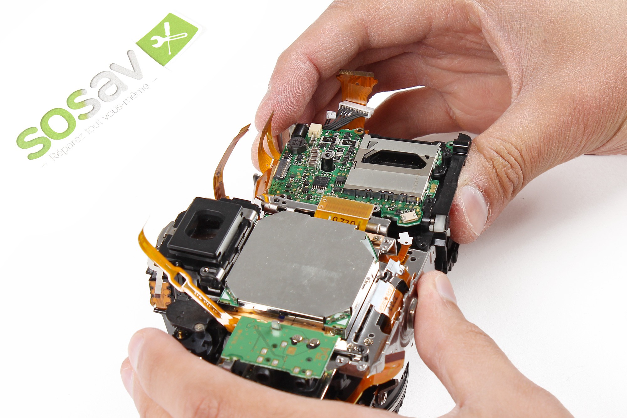 Saisissez l'appareil puis soulevez très délicatement par la gauche la façade avant afin de la déclipser du reste de l'appareil.N'essayez pas d'ôter totalement la façade à cette étape ! Une nappe relie la façade avant au reste de l'appareil photo.