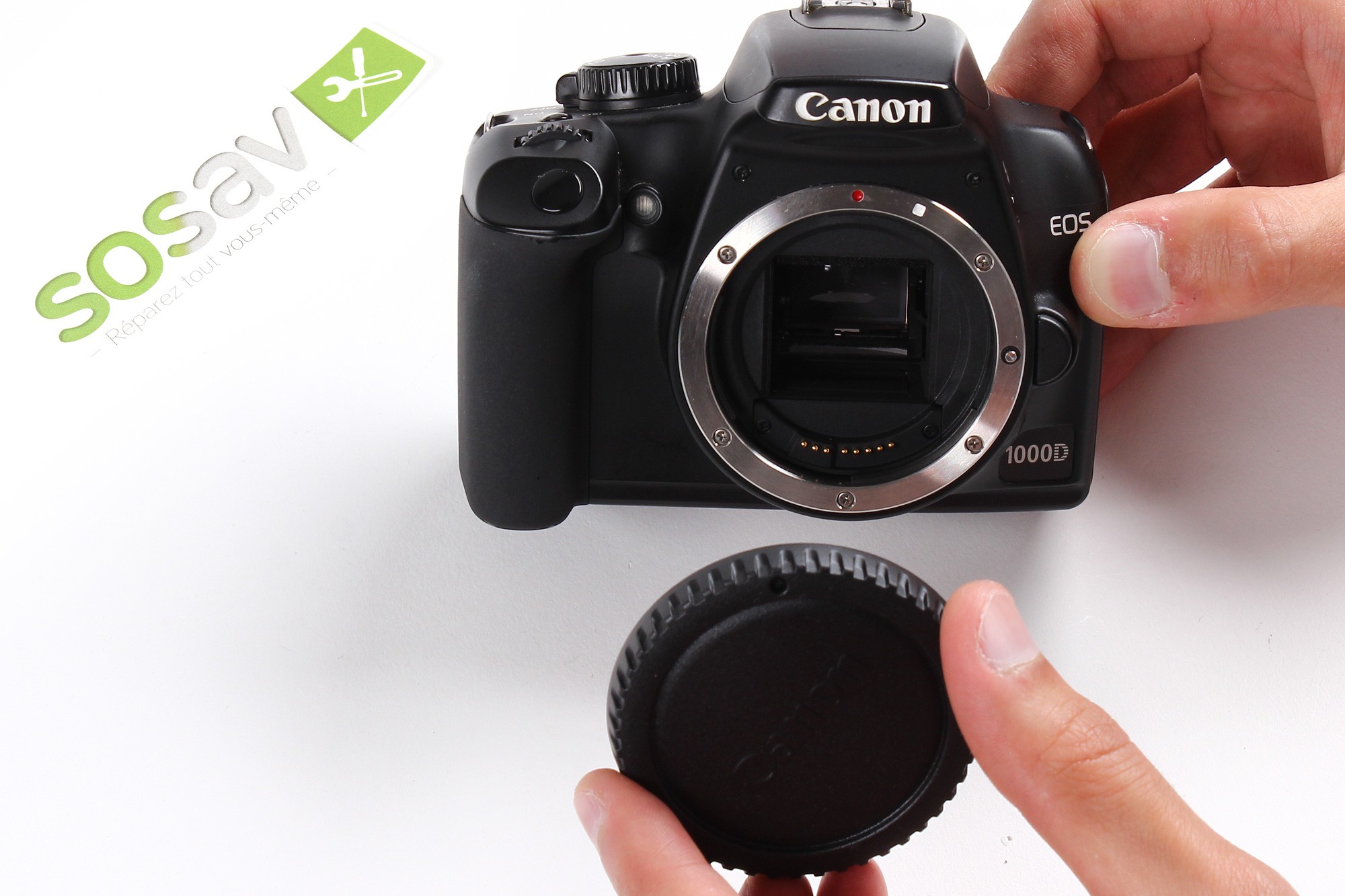 Posez ensuite le cache de l'appareil afin de protéger le capteur des éventuelles poussières pouvant s'y déposer.Une fois posé, tournez ce cache dans le sens des aiguilles d'une montre afin de le verrouiller correctement en place.