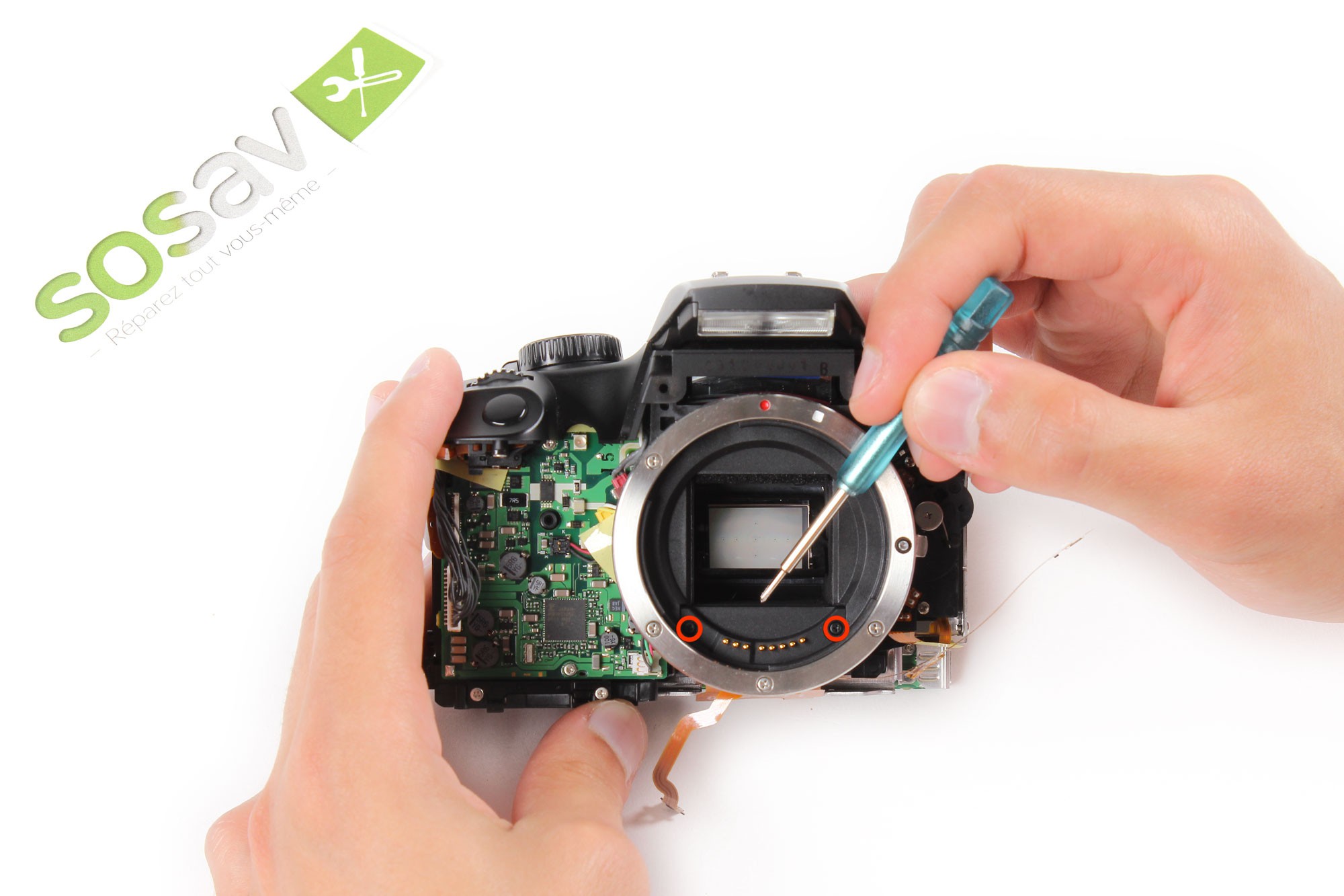 A l'aide d'un tournevis cruciforme, dévissez les deux vis entourées en rouge.Ces vis servent à maintenir le support des contacts de l'objectif.