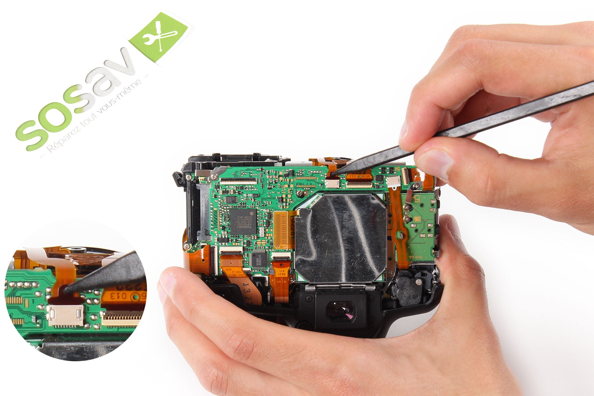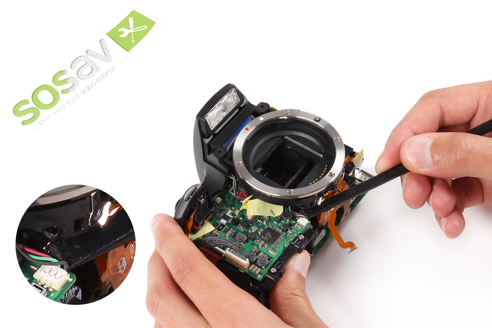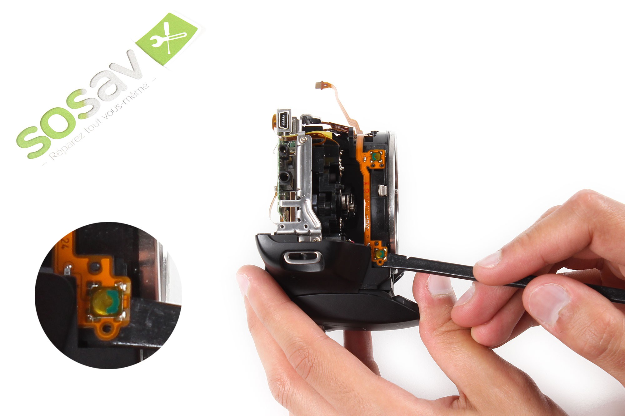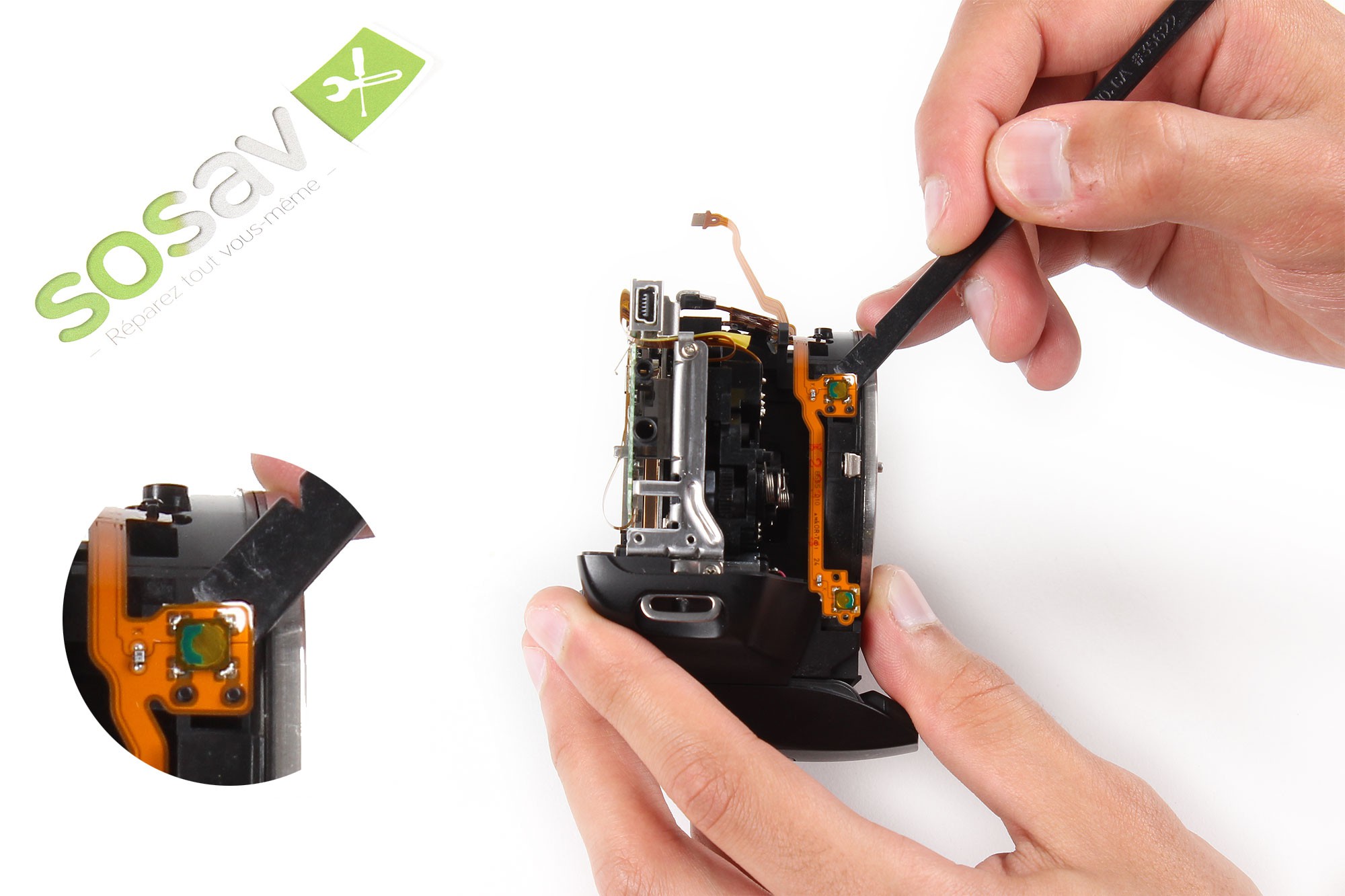 Prenez la pointe de la spatule en nylon et insérez-la dans le trou de la nappe des boutons latéraux / contacts objectif.Tirez ensuite très délicatement cette dernière afin de la déloger de son connecteur.Note : Soyez très délicat lors de cette opération afin de ne pas endommager la nappe !