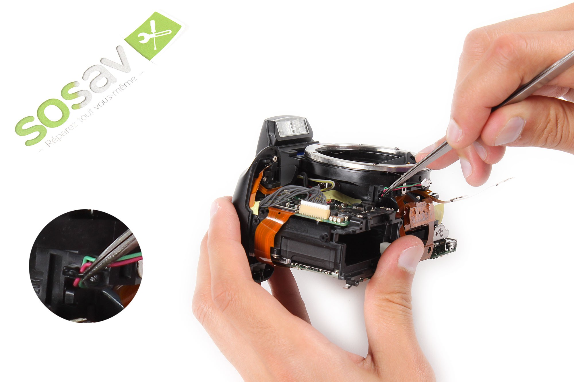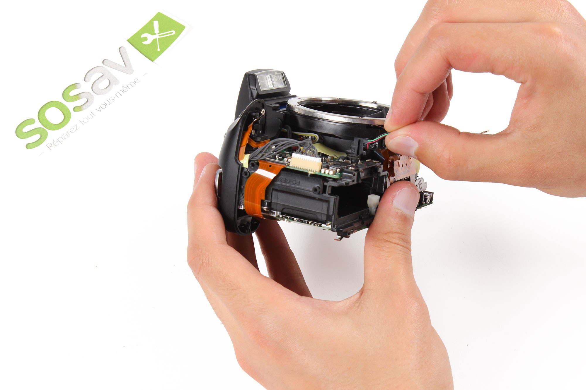 Sortez très délicatement les fils d'alimentation du support des contacts de l'objectif de leur logement.