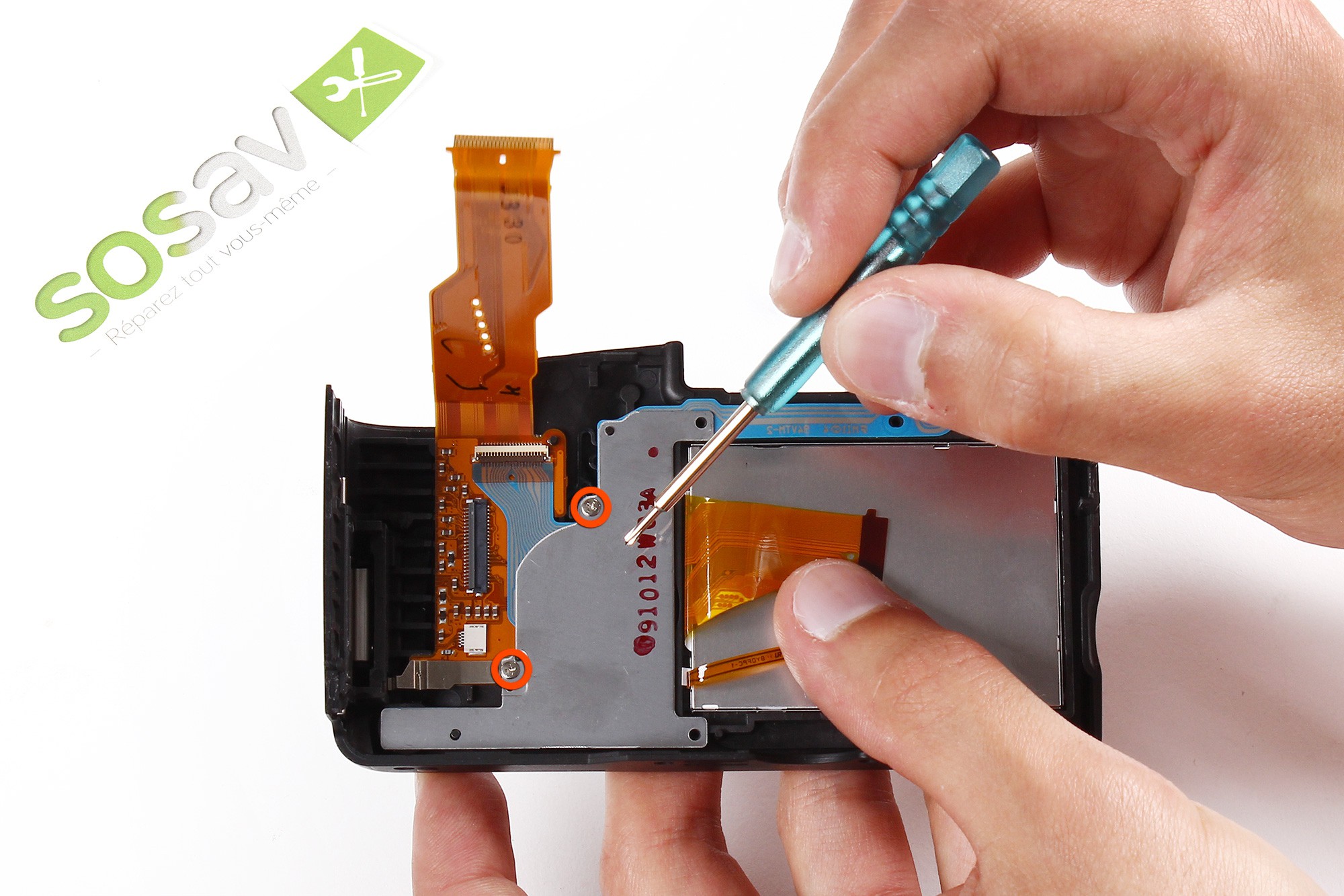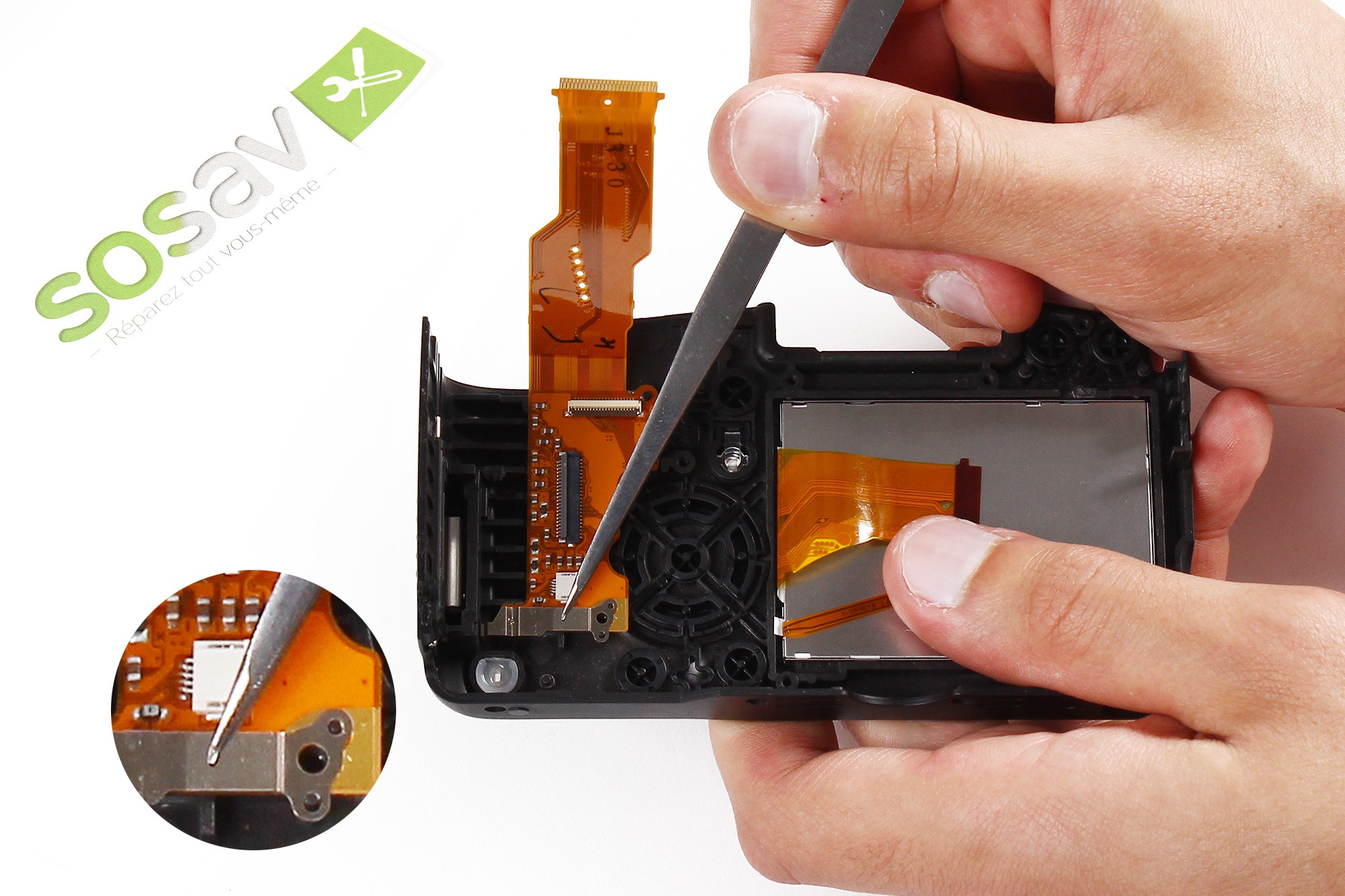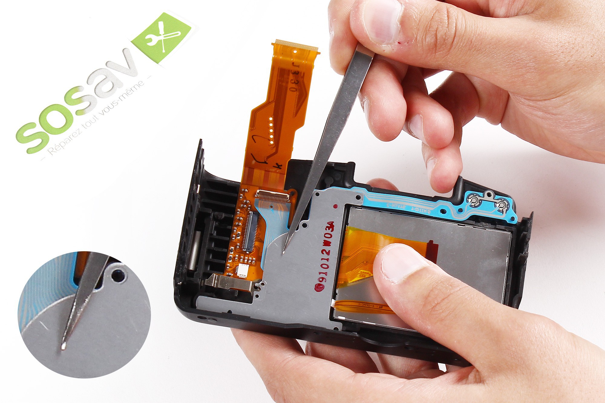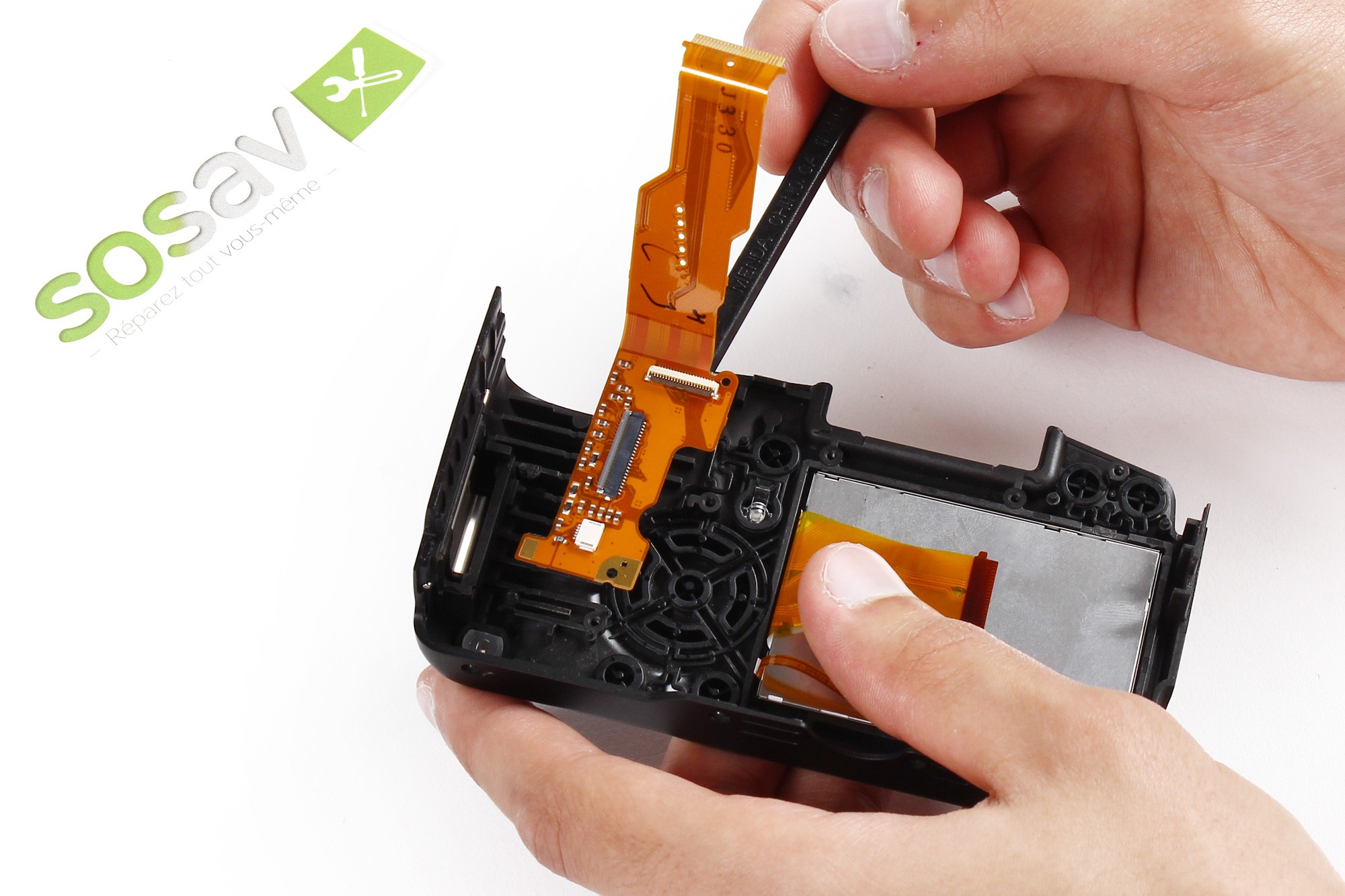 Saisissez l'appareil puis soulevez très délicatement par la gauche la façade avant afin de la déclipser du reste de l'appareil.N'essayez pas d'ôter totalement la façade à cette étape ! Une nappe relie la façade avant au reste de l'appareil photo.