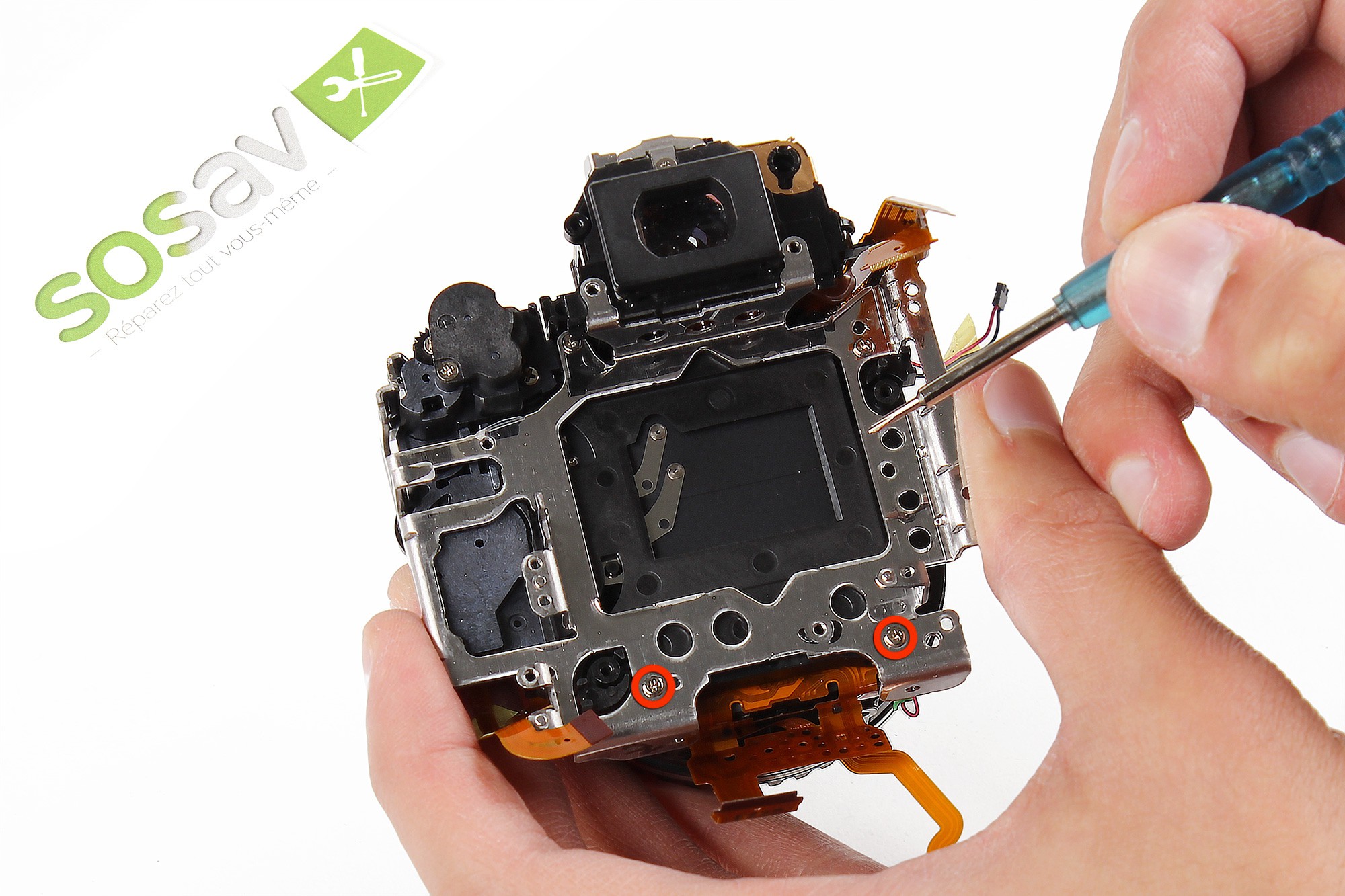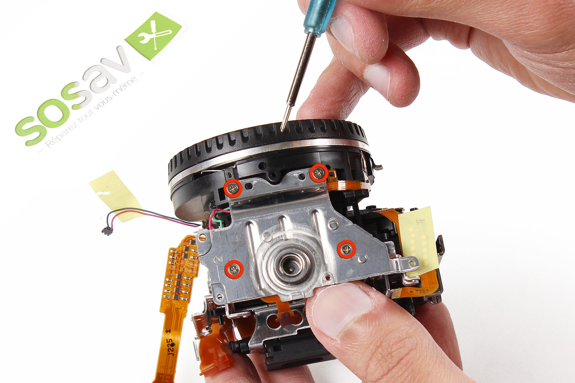 A l'aide d'un tournevis cruciforme, dévissez les trois vis entourées en rouge.Ces vis servent à maintenir la coque avant de l'appareil photo.