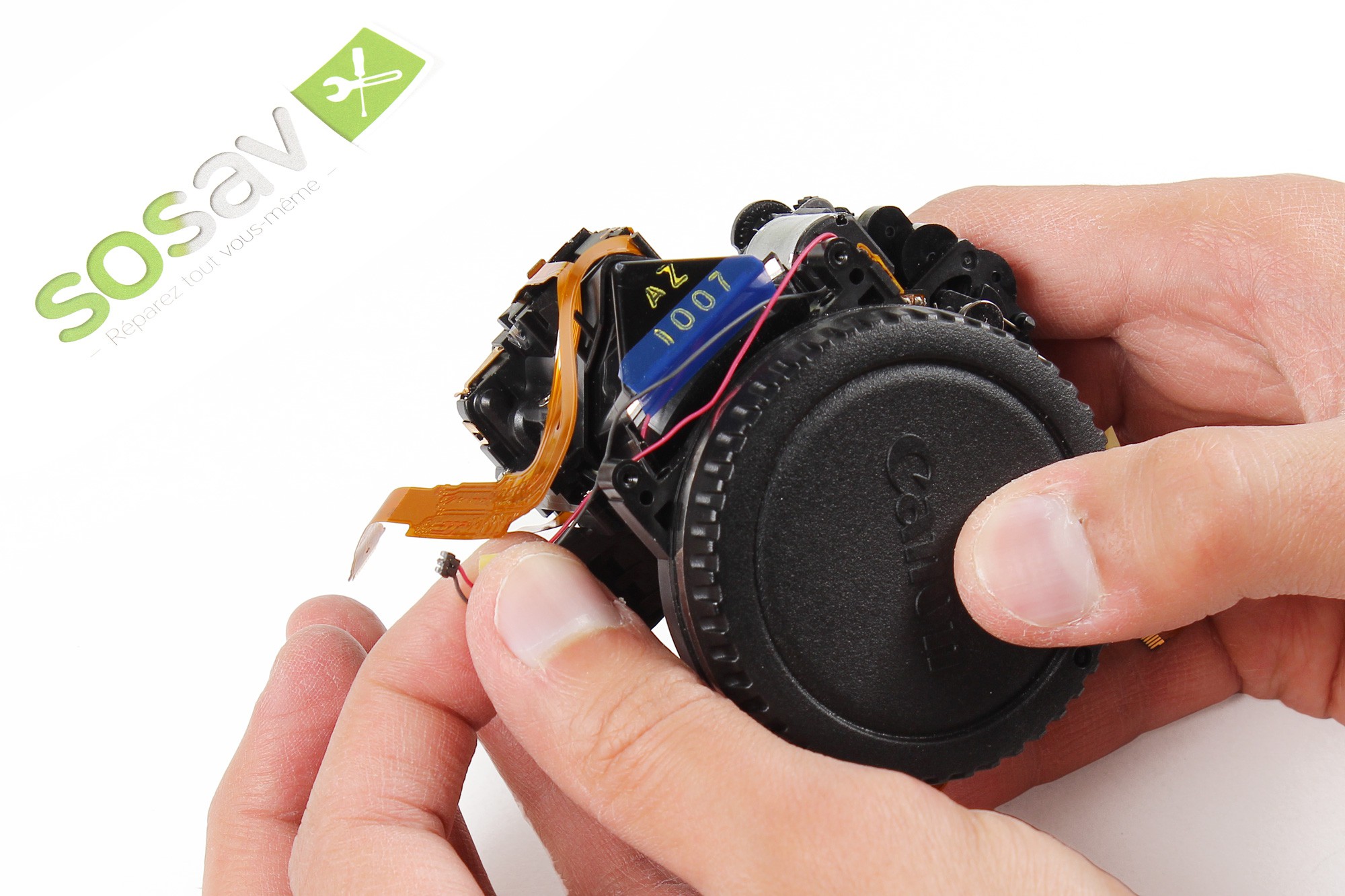 Toujours avec la pointe d'une spatule en nylon, déconnectez l'ensemble de câbles d'alimentation de l'objectif.