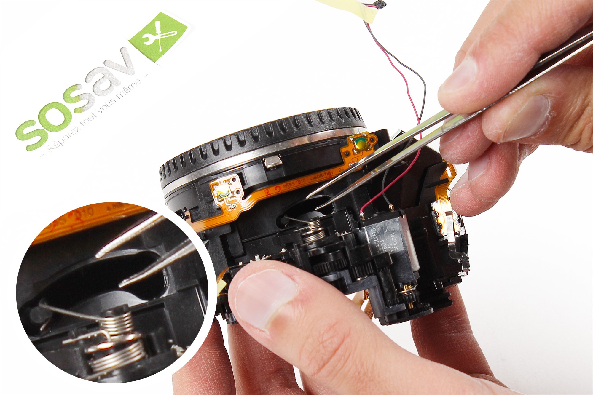 A l'aide d'une pince, soulevez très délicatement le ressort métallique puis faites le passer par dessus l'élément en plastique noir situé à gauche.