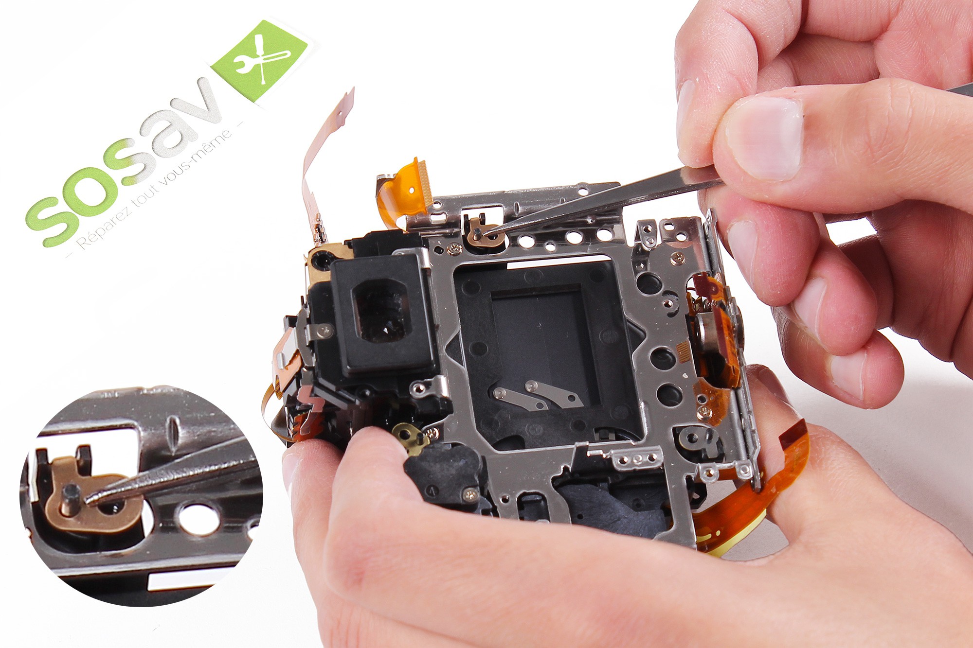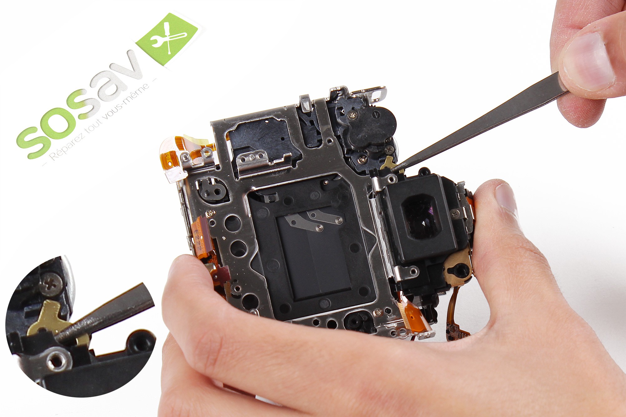 Utilisez la pointe de la spatule en nylon afin de retirer la nappe de liaison des boutons/connecteur de l'objectif.