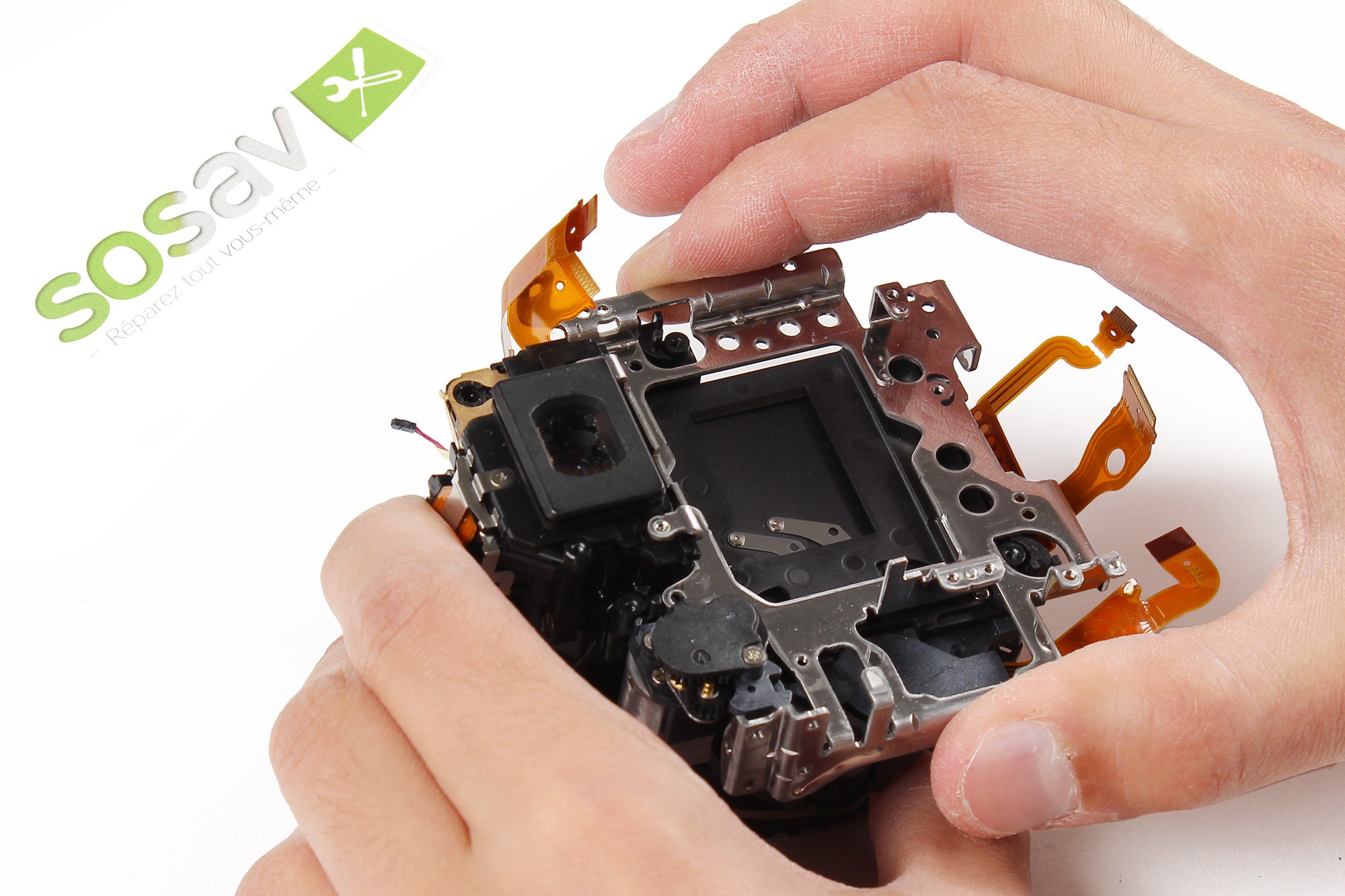 Saisissez l'appareil puis soulevez très délicatement par la gauche la façade avant afin de la déclipser du reste de l'appareil.N'essayez pas d'ôter totalement la façade à cette étape ! Une nappe relie la façade avant au reste de l'appareil photo.
