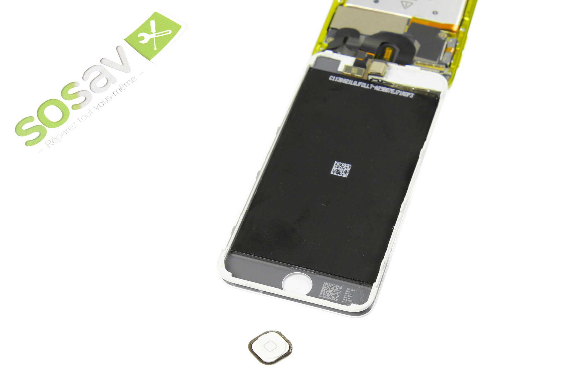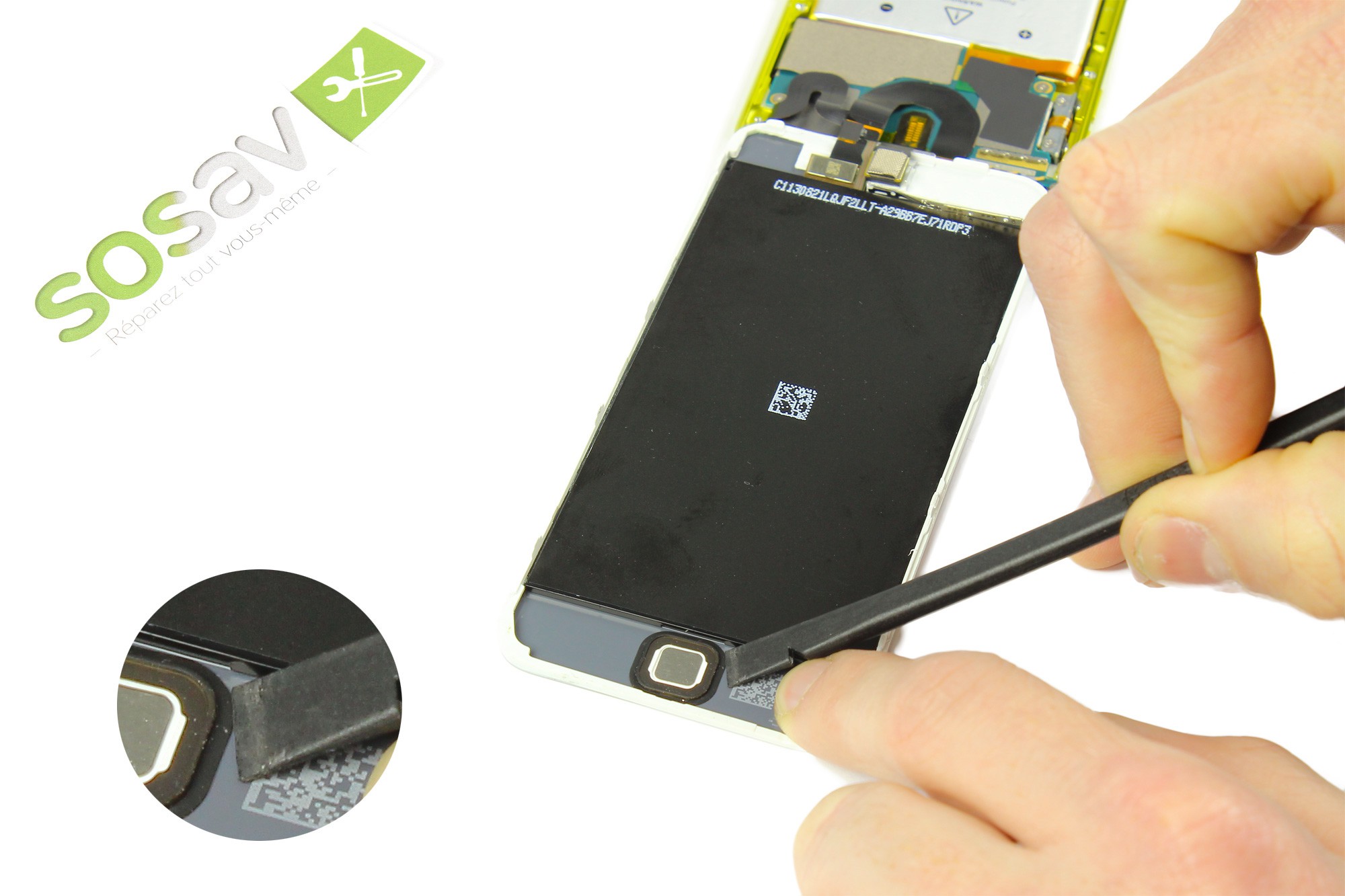 A l'aide d'une spatule en nylon, Reprendre la spatule afin de décoller et sortir le bouton home de son emplacement