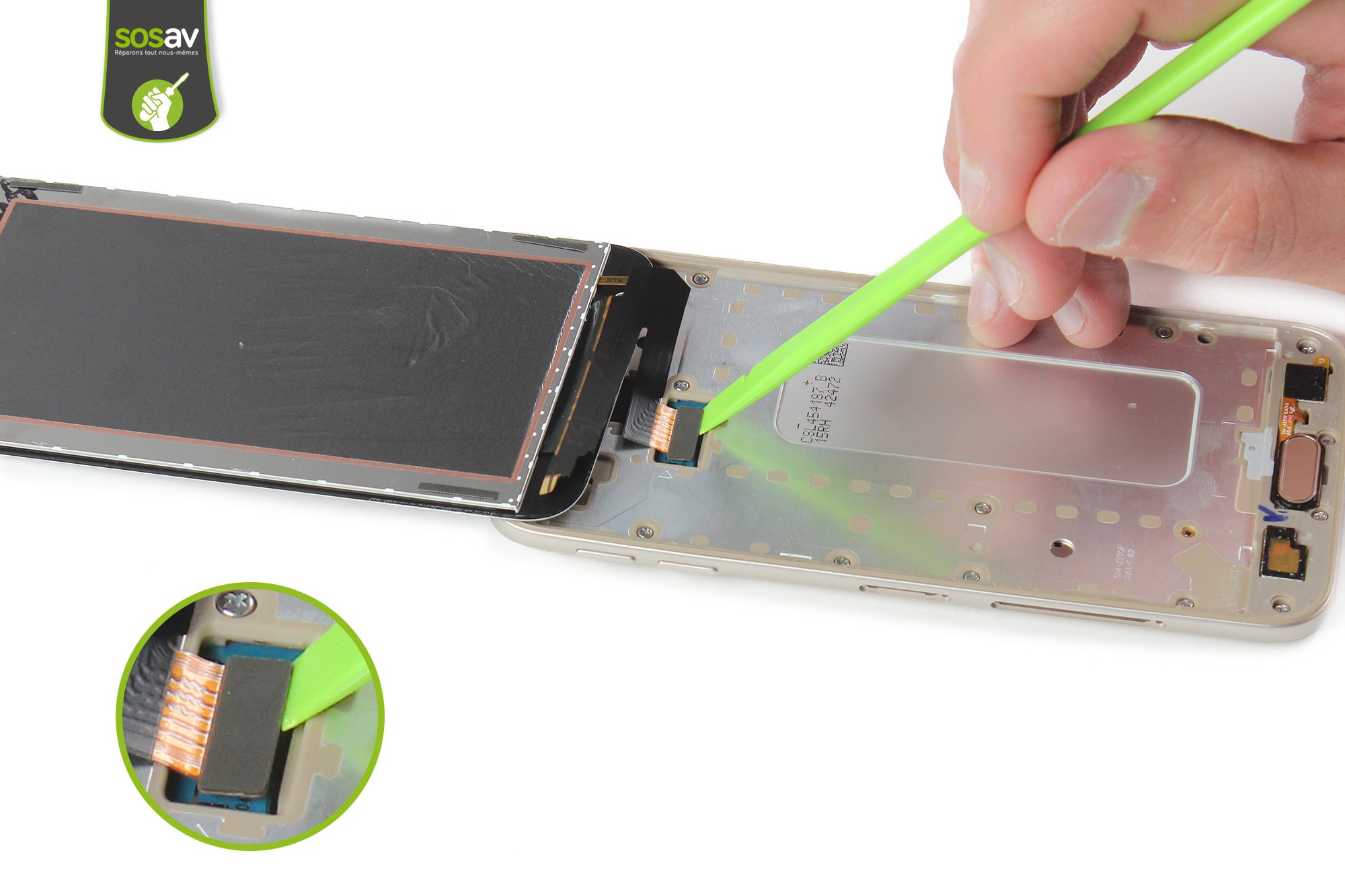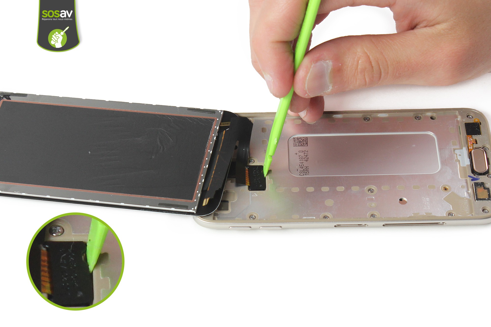 Déconnectez ensuite, toujours avec la spatule en nylon, la nappe de l'écran.Procédez au retrait de l'écran.