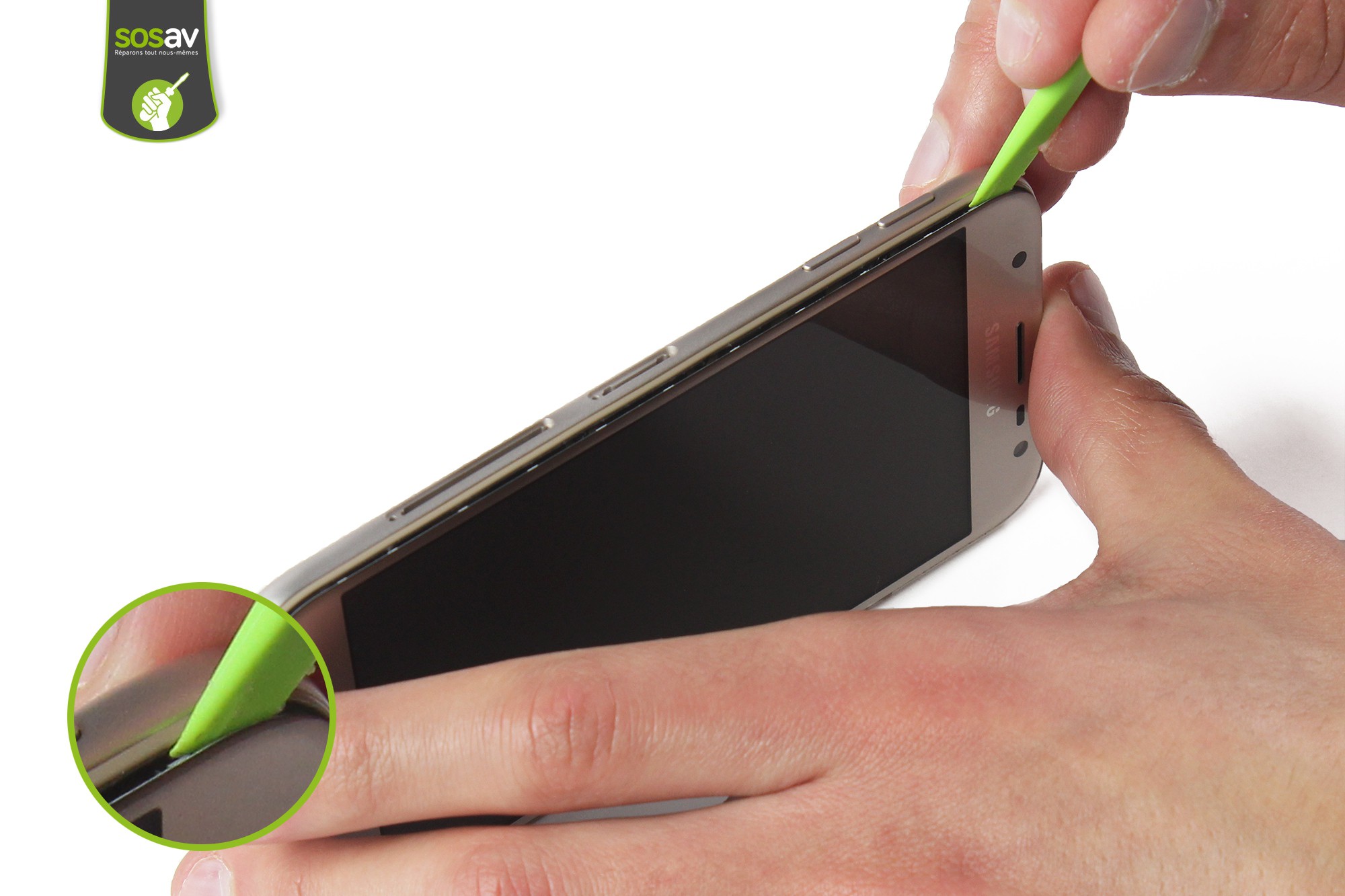 Insérez, sur environ 0,5cm, une spatule en nylon dans l'interstice supérieur gauche de l'écran.