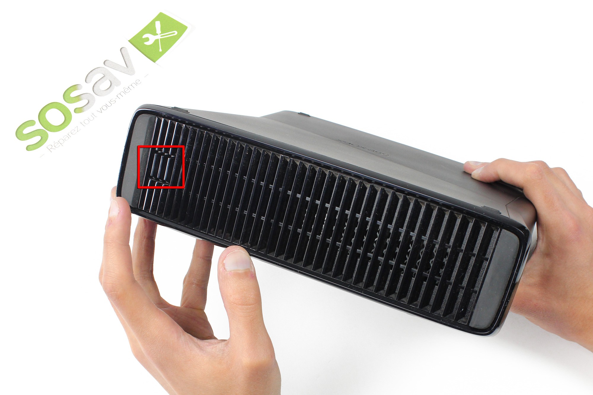 Le panneau supérieur de la Xbox 360 S est attaché par de multiple clips à la console. L'emplacement de chacun de ces clips est simple à repérer, ils sont localisés sous chaque emplacement de forme rectangulaire.