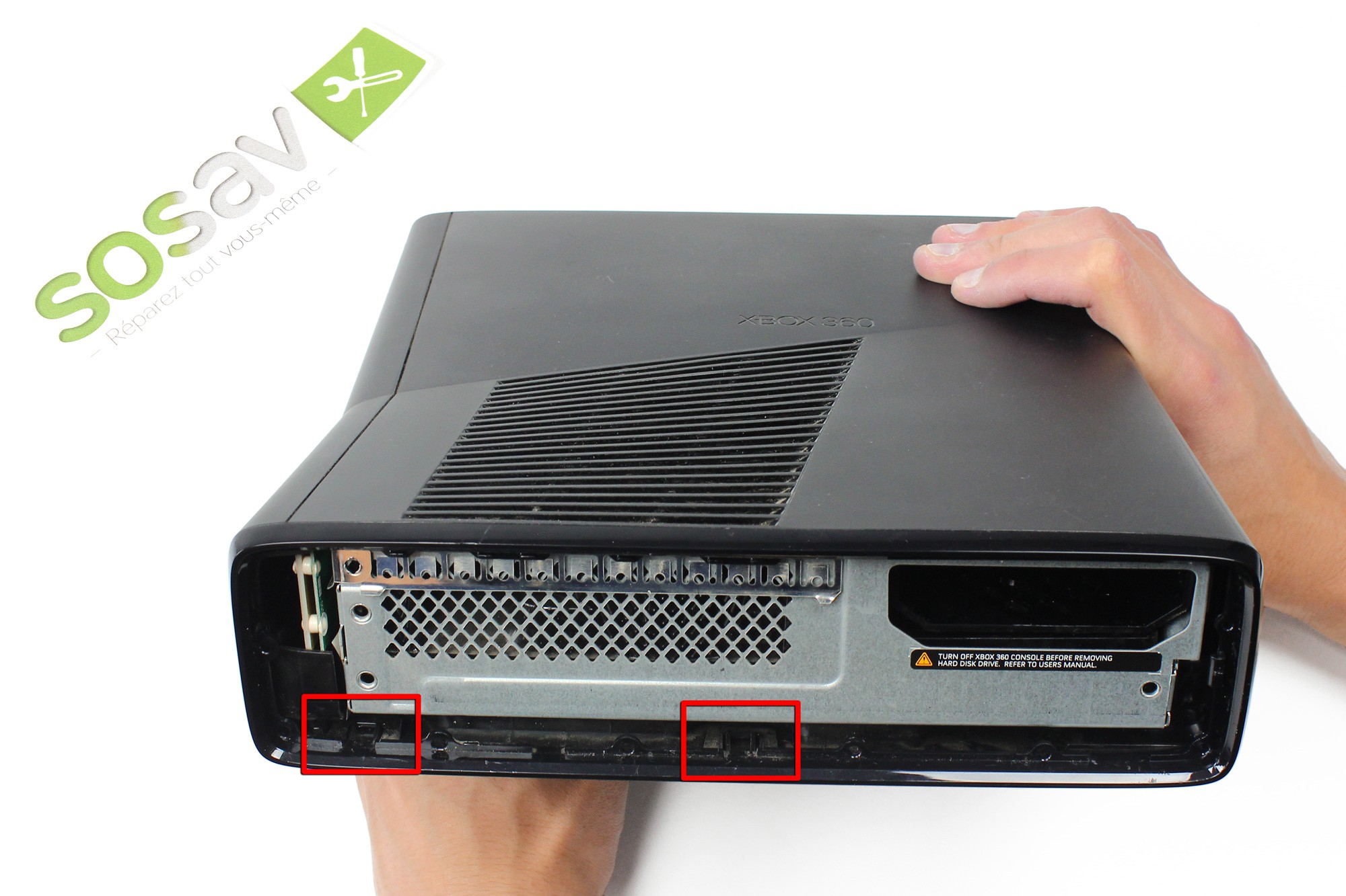 2 clips, situés cette fois-ci sur la partie inférieur, maintiennent ensemble les panneaux droit et gauche de la Xbox 360 S. Ceux-ci sont situés à coté de l'emplacement pour disque dur.