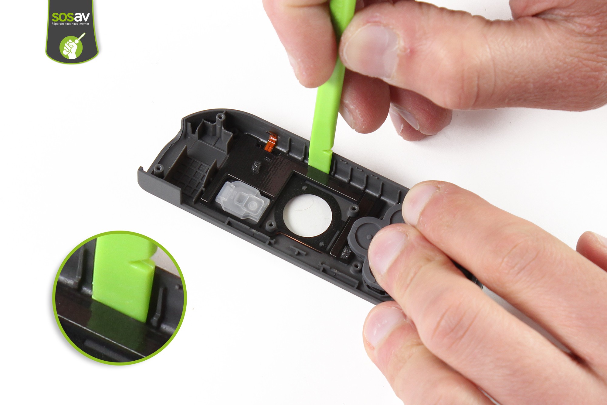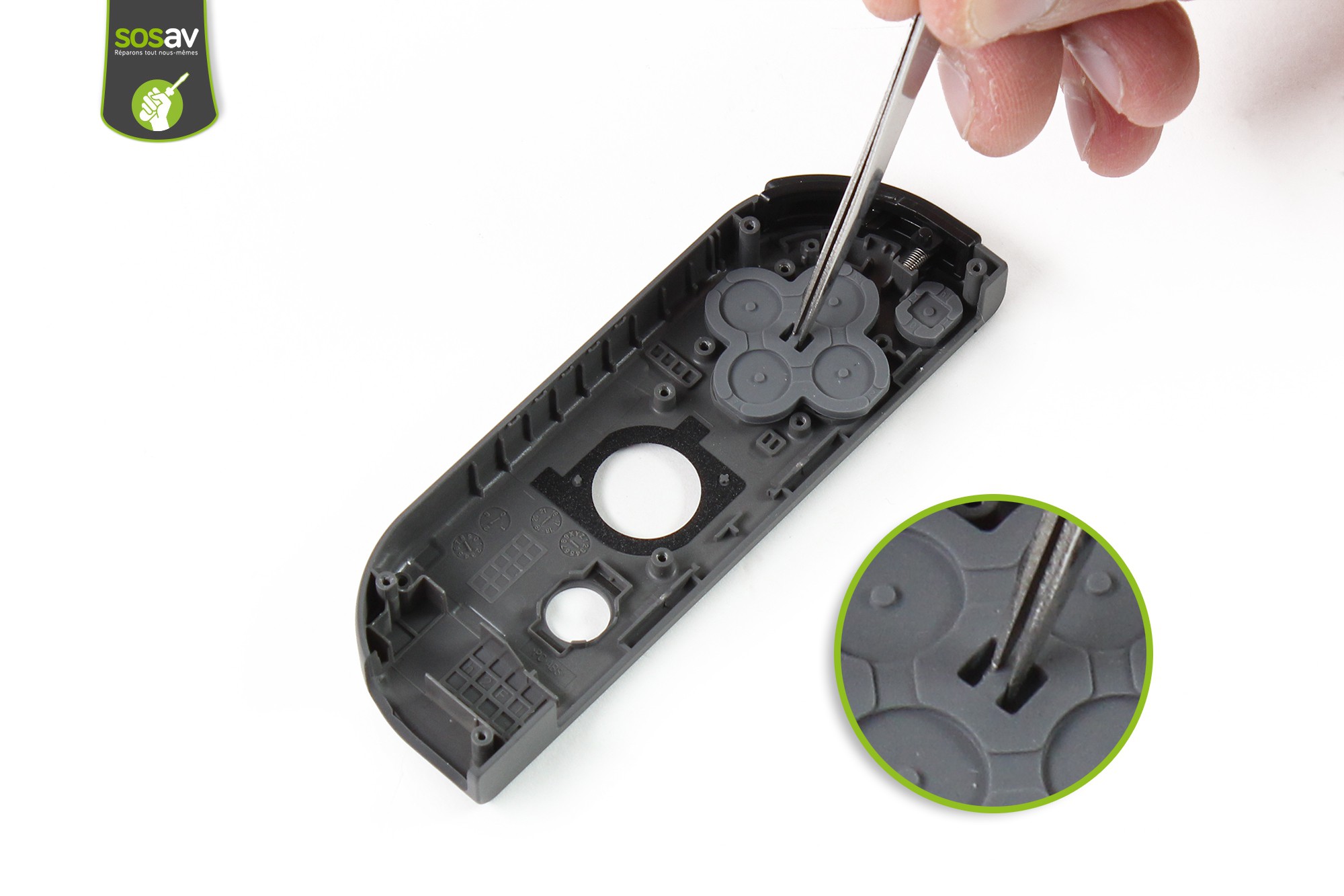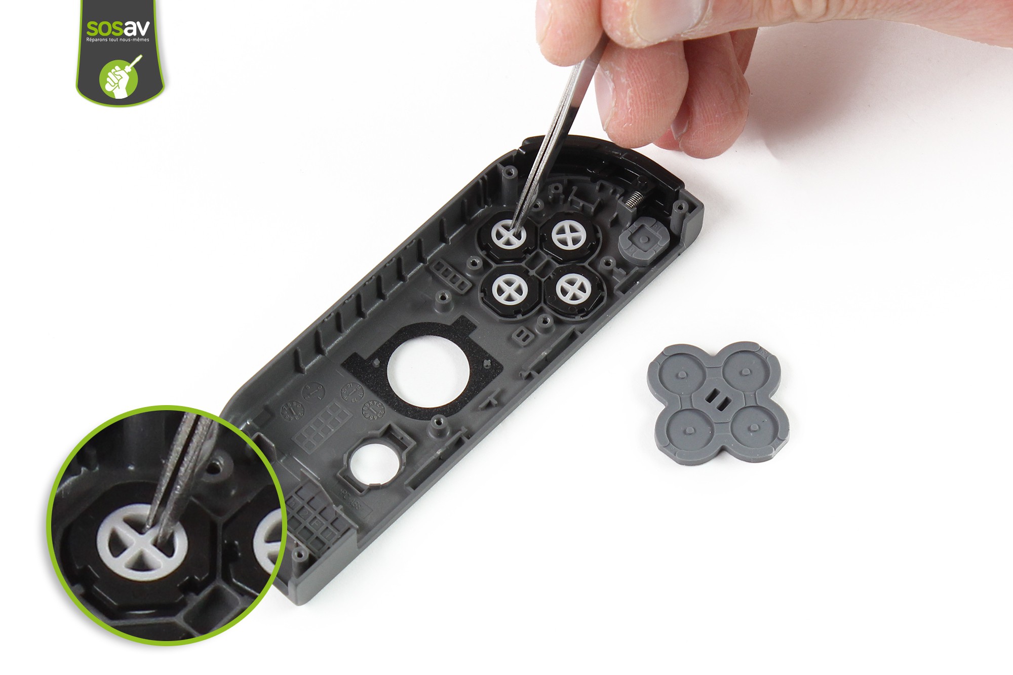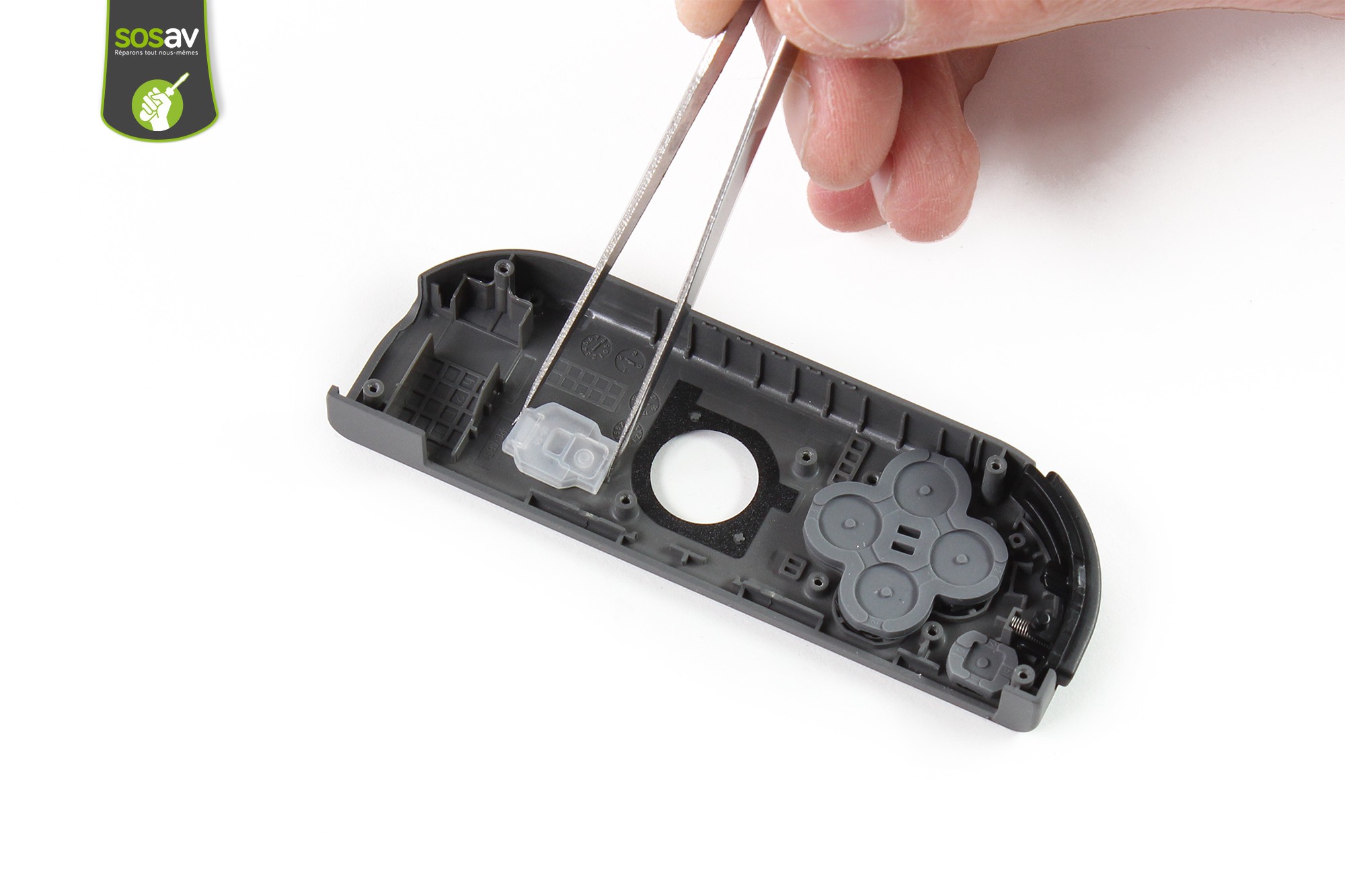 Saisissez ensuite le caoutchouc d'appui des boutons d'action et procédez à son retrait à l'aide de la pince.