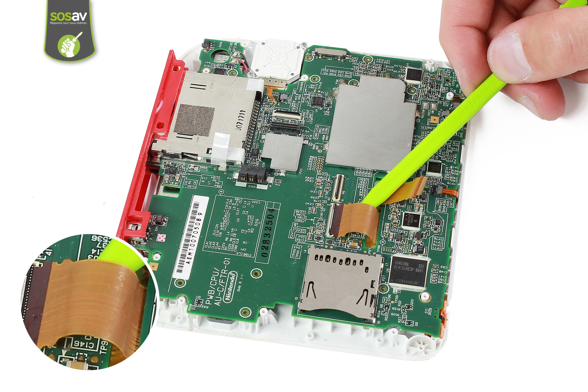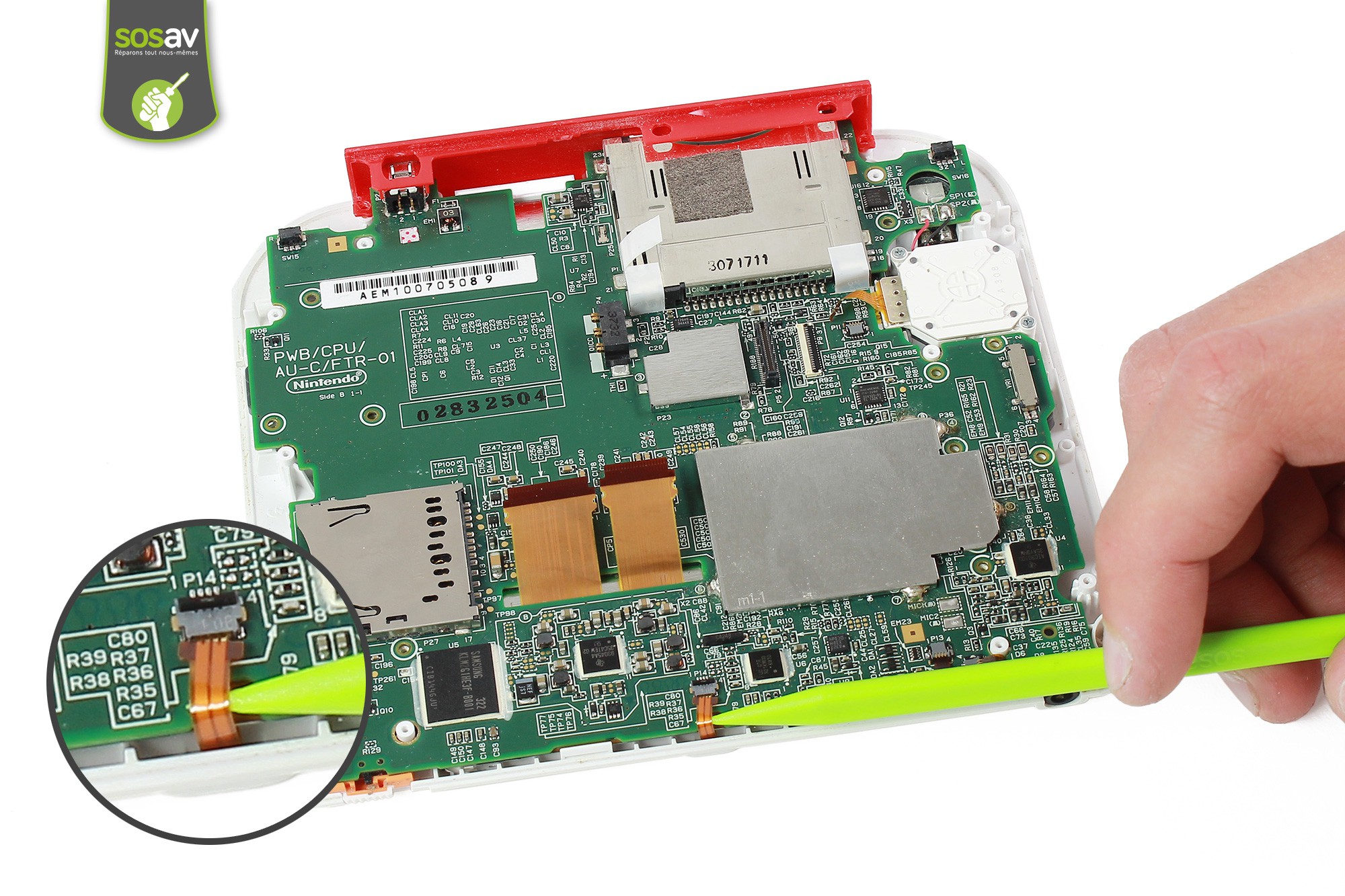Utilisez un tournevis cruciforme afin de dévisser les 13 vis entourées en rouge servant à maintenir la carte mère.Avec la spatule en nylon, déverrouillez ensuite le connecteur de la nappe du joystick analogique.