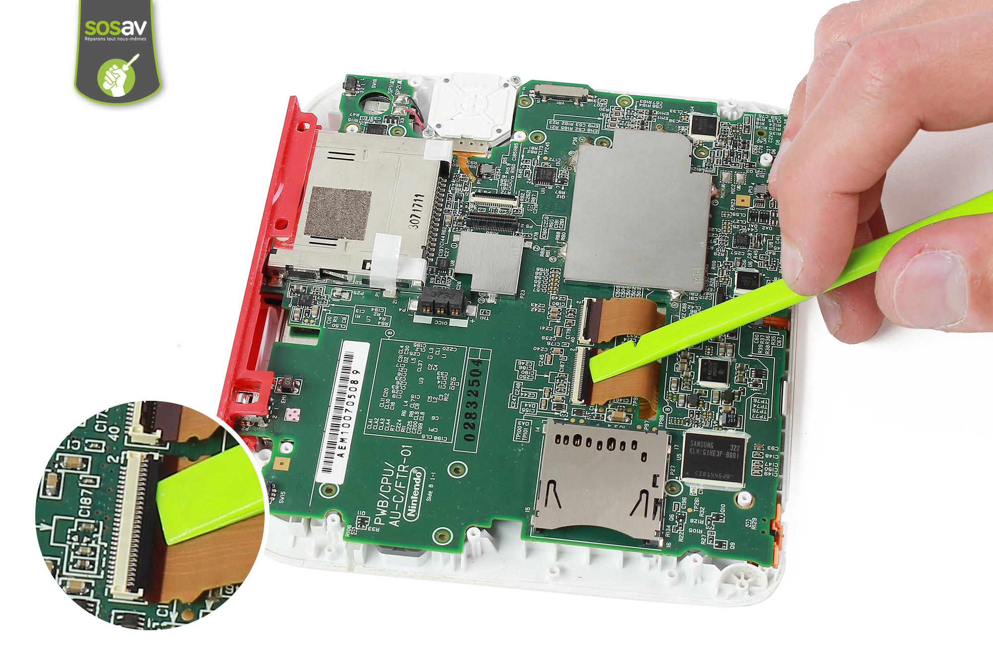Toujours avec la spatule en nylon, sortez la nappe de liaison du joystick analogique de son connecteur.Déverrouillez le premier connecteur de l'écran.