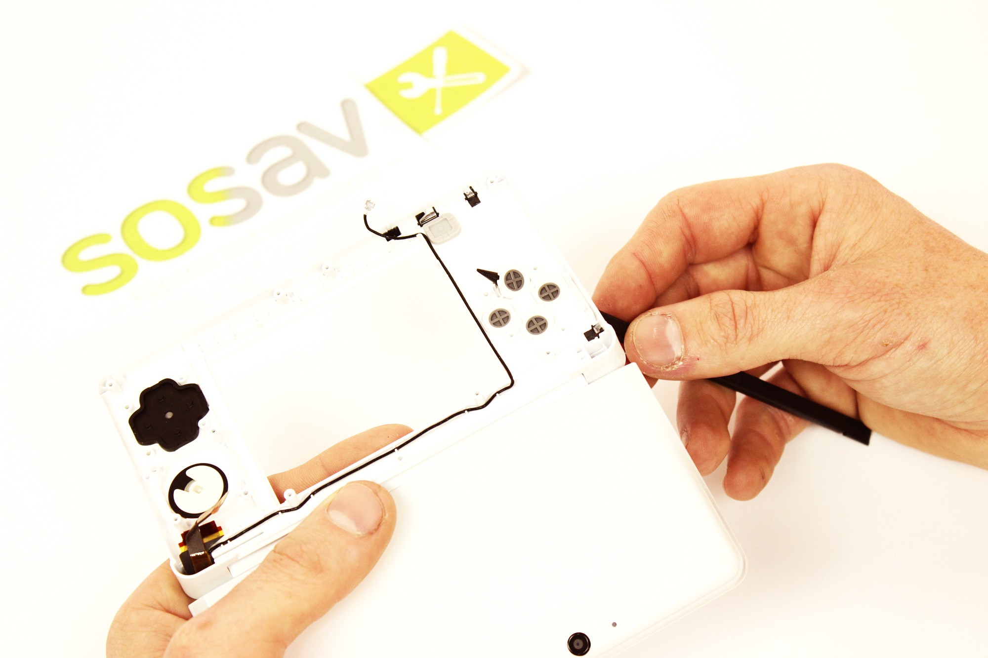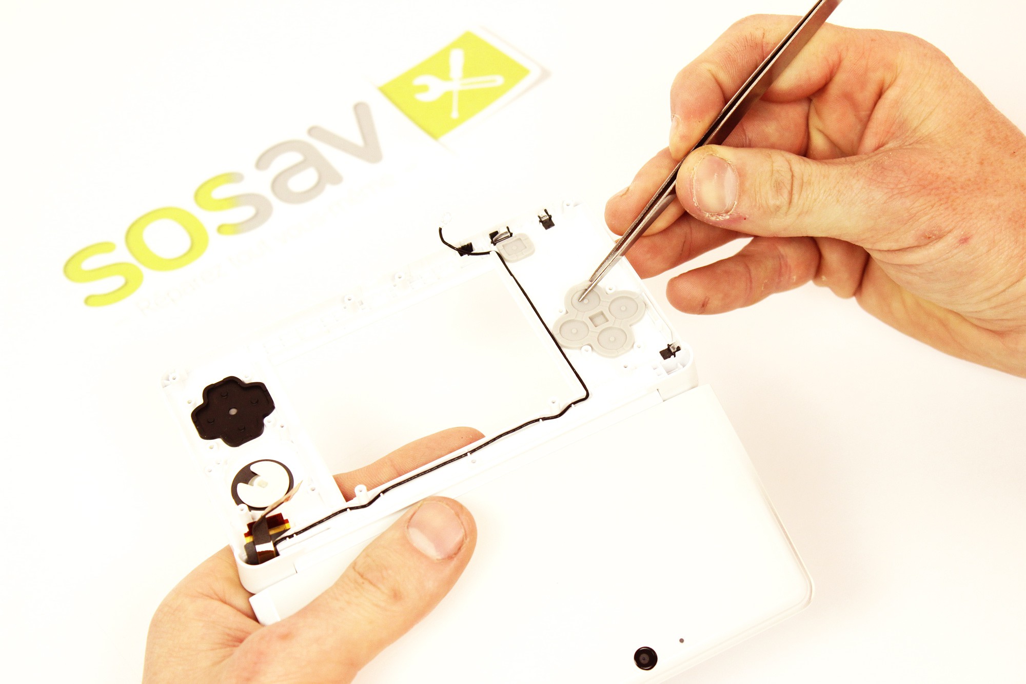 Ouvrez désormais votre Nintendo 3DS.A l'aide d'une pince, enlevez le caoutchouc de protection des touches ABXY