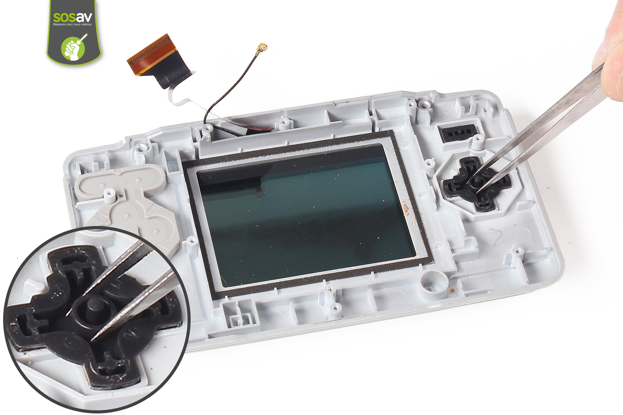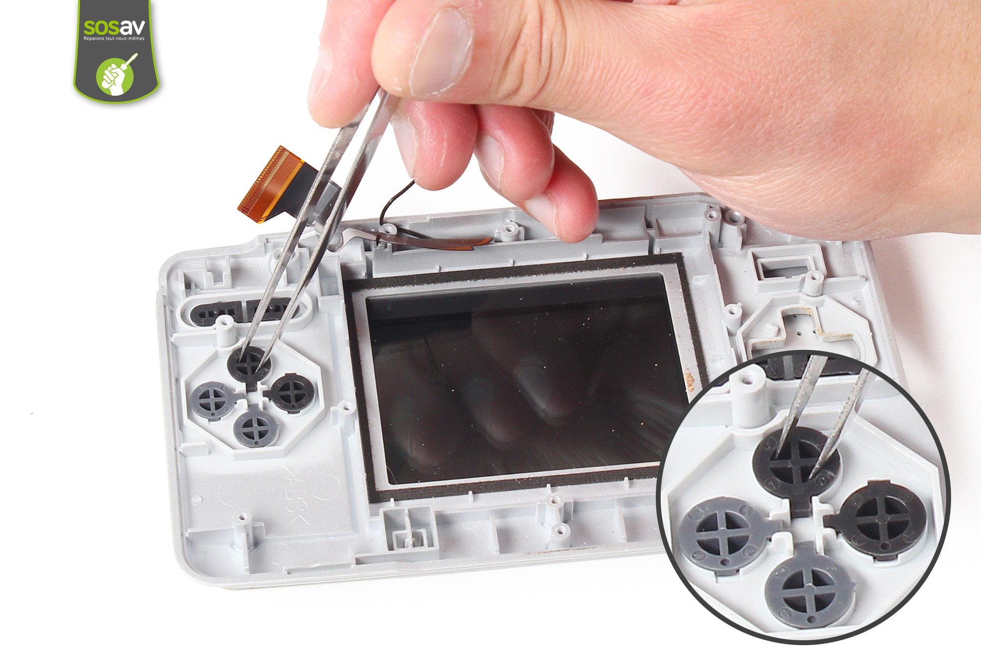 Toujours avec la pince, procédez au retrait des boutons d'action, start et select.