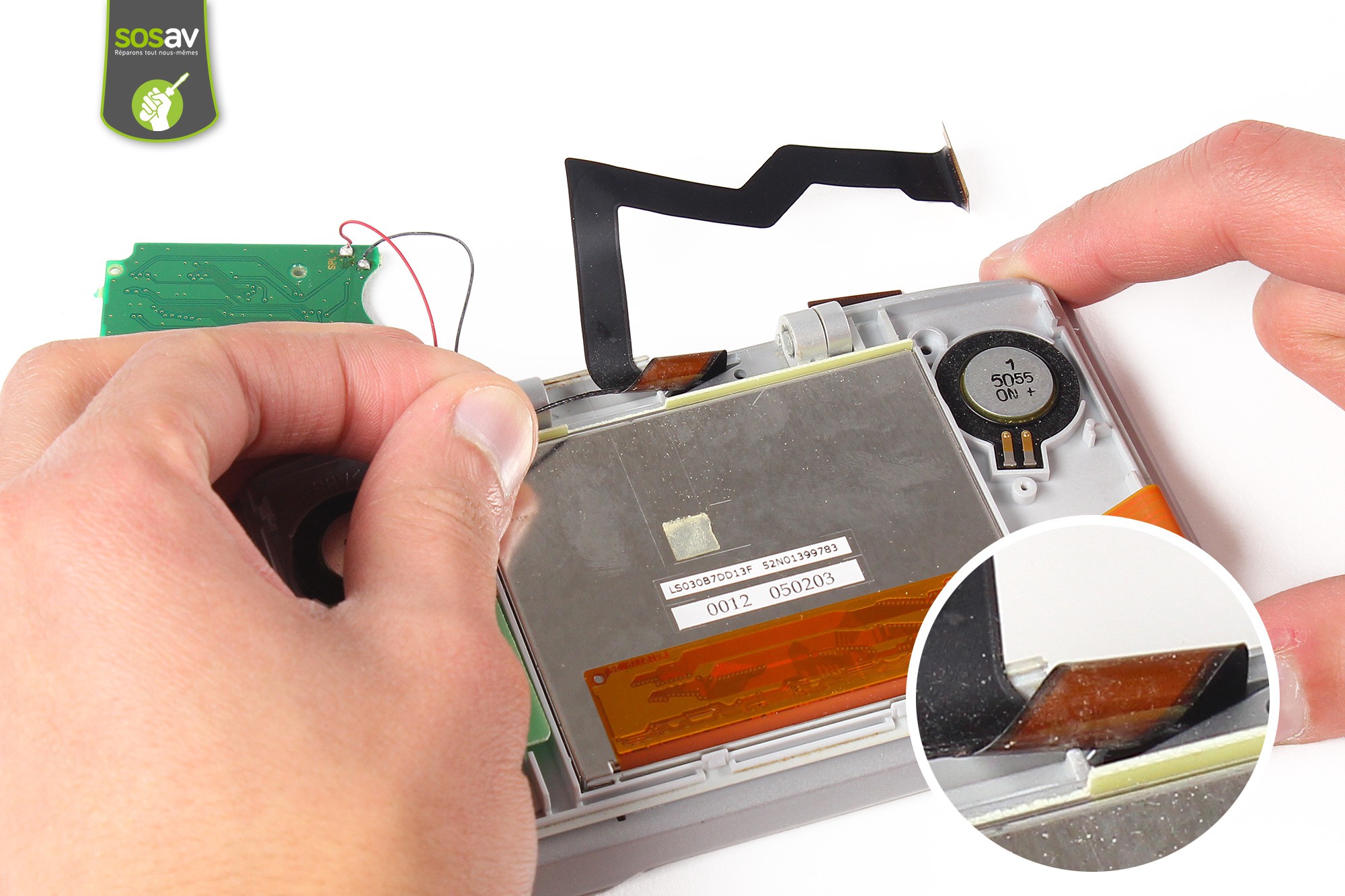Retirez la nappe du rétroéclairage de l'écran LCD supérieur en utilisant la pointe de la spatule en nylon.Déplacez ensuite délicatement la carte de gestion afin d'accéder à l'écran LCD supérieur.