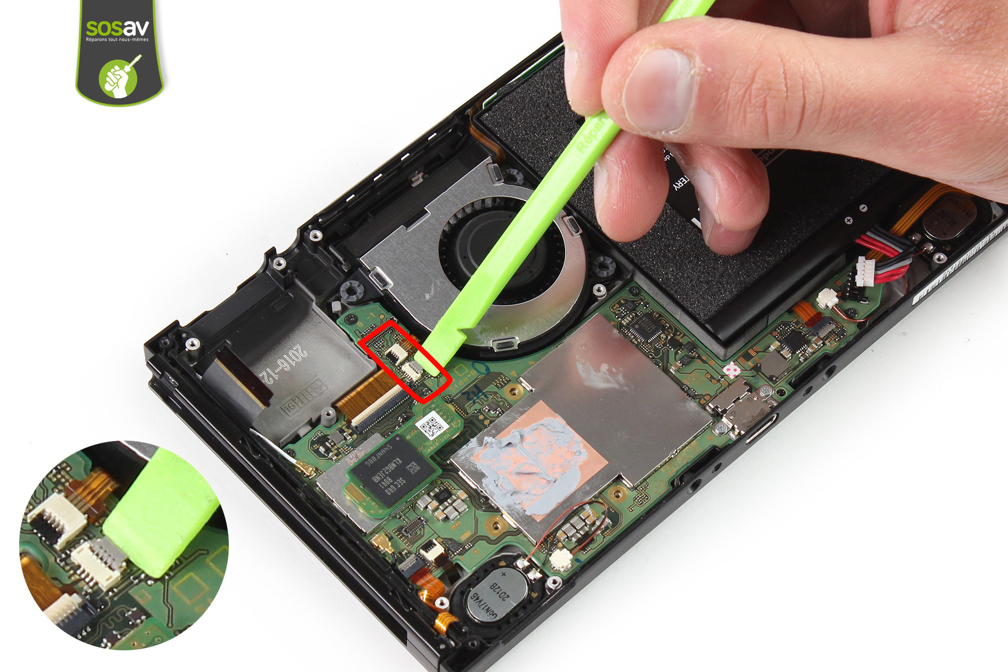 Reprenez la spatule en nylon afin de déverrouiller le connecteur de la nappe du ventilateur.Sortez la nappe de son connecteur grâce à la spatule en nylon.