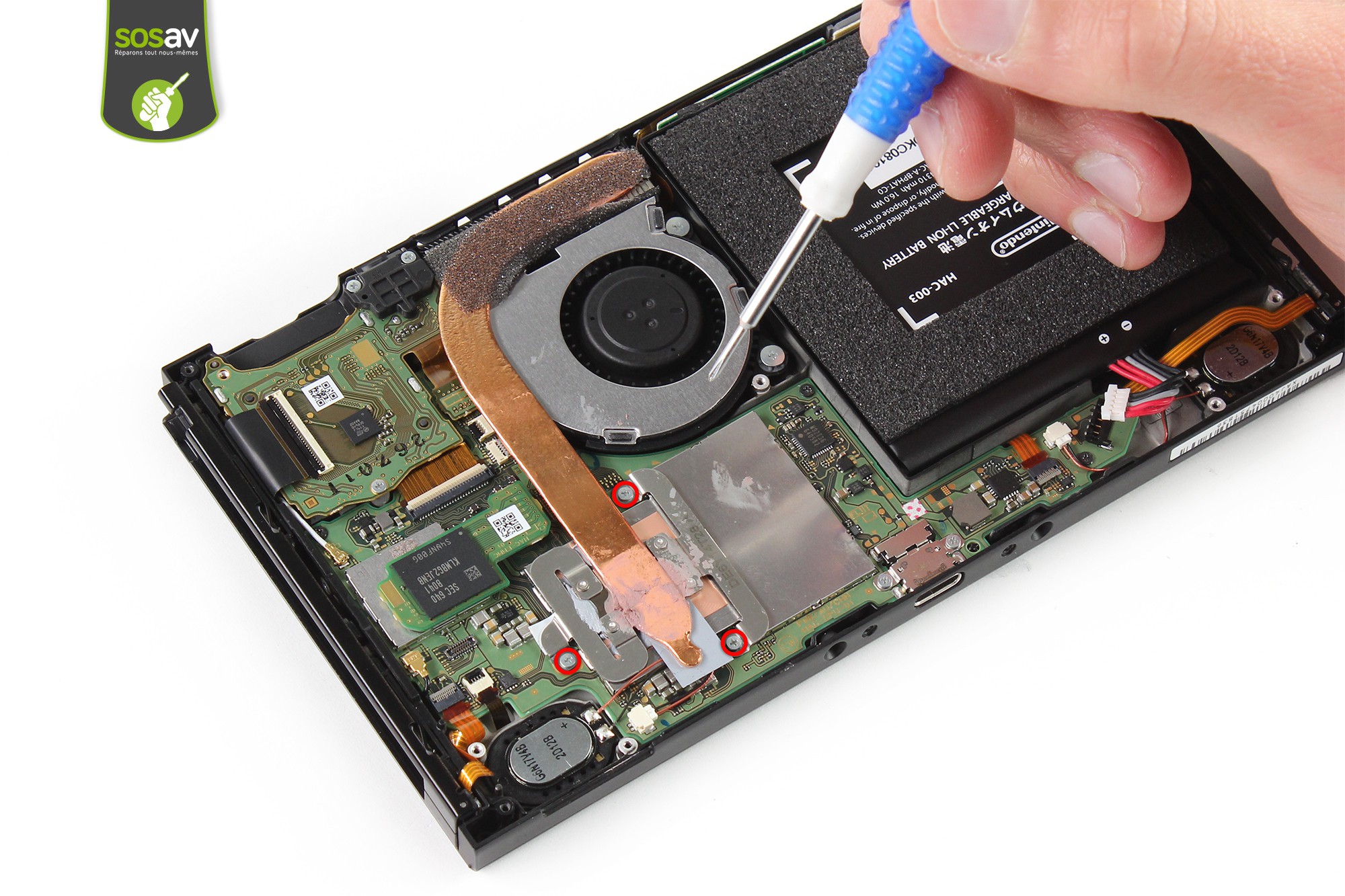 Avec le tournevis cruciforme, dévissez les trois vis entourées en rouge servant à maintenir le radiateur de la console.