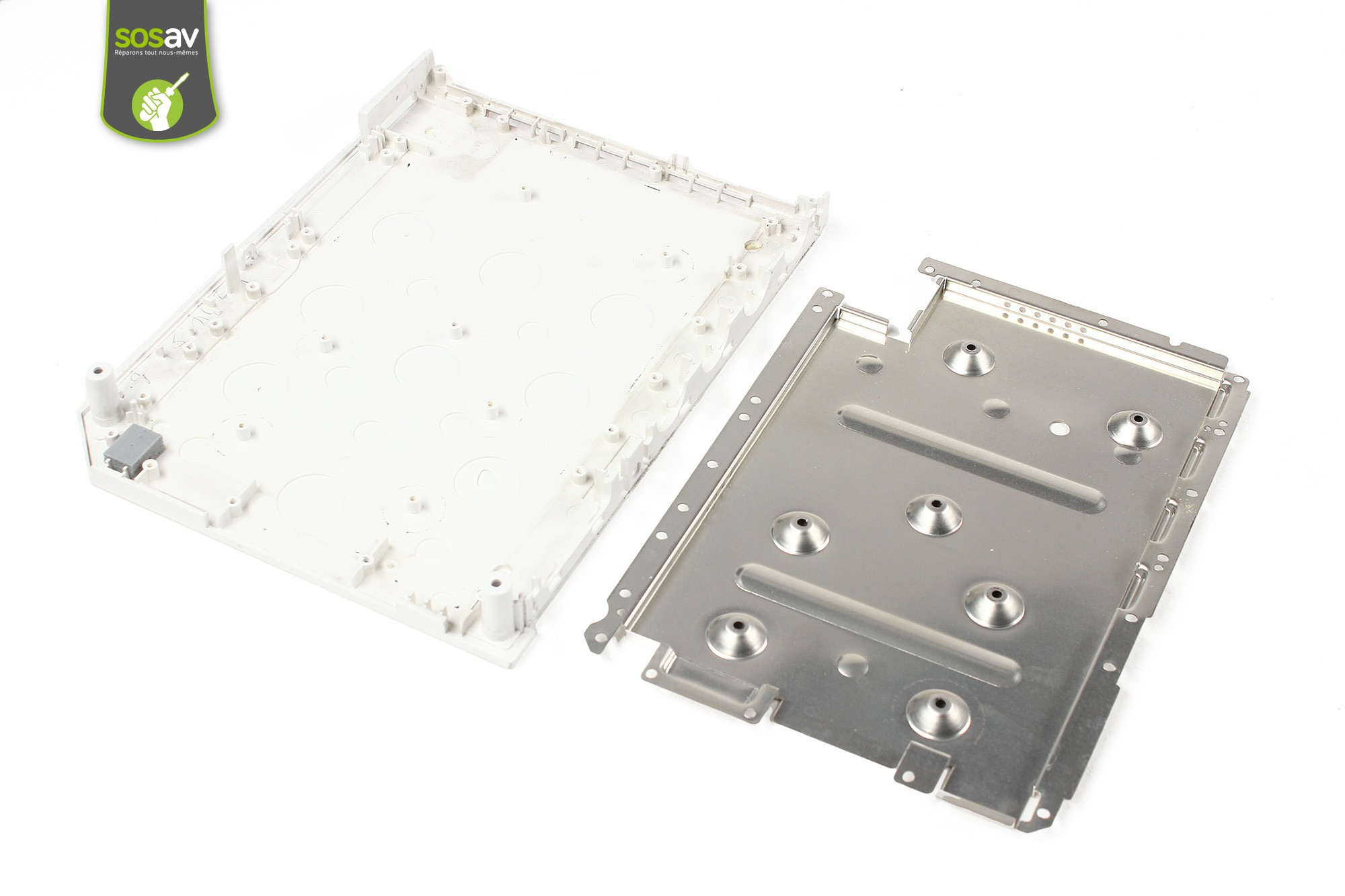 La coque inférieure de la Nintendo Wii est désormais démontée.Procédez à son remplacement par une pièce neuve si cela est nécessaire.
