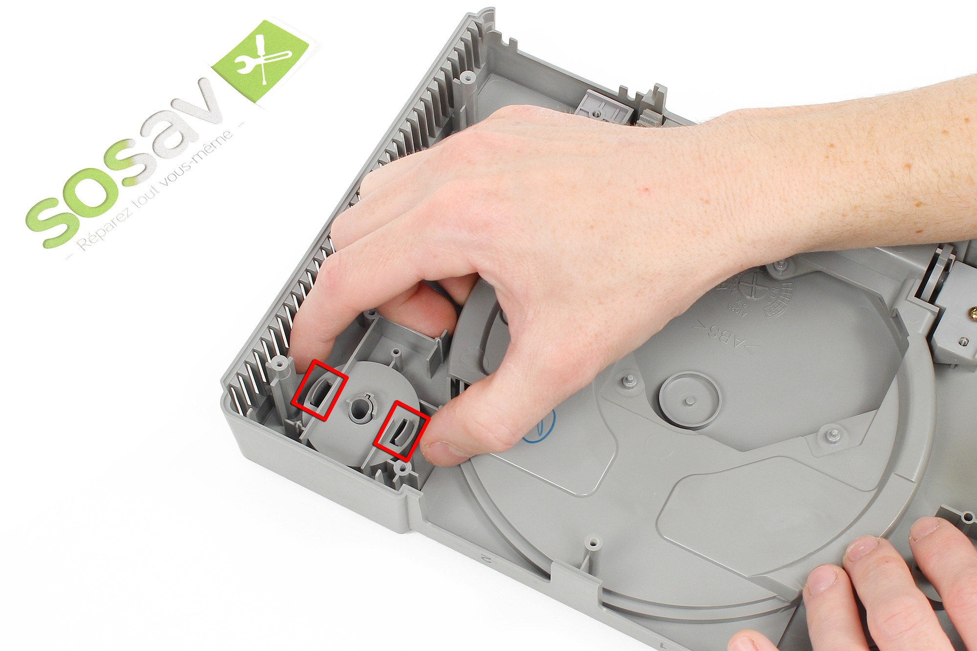 Saisissez désormais la plaque de maintien en plastique du bouton Open, puis ôtez-la de la PlayStation.