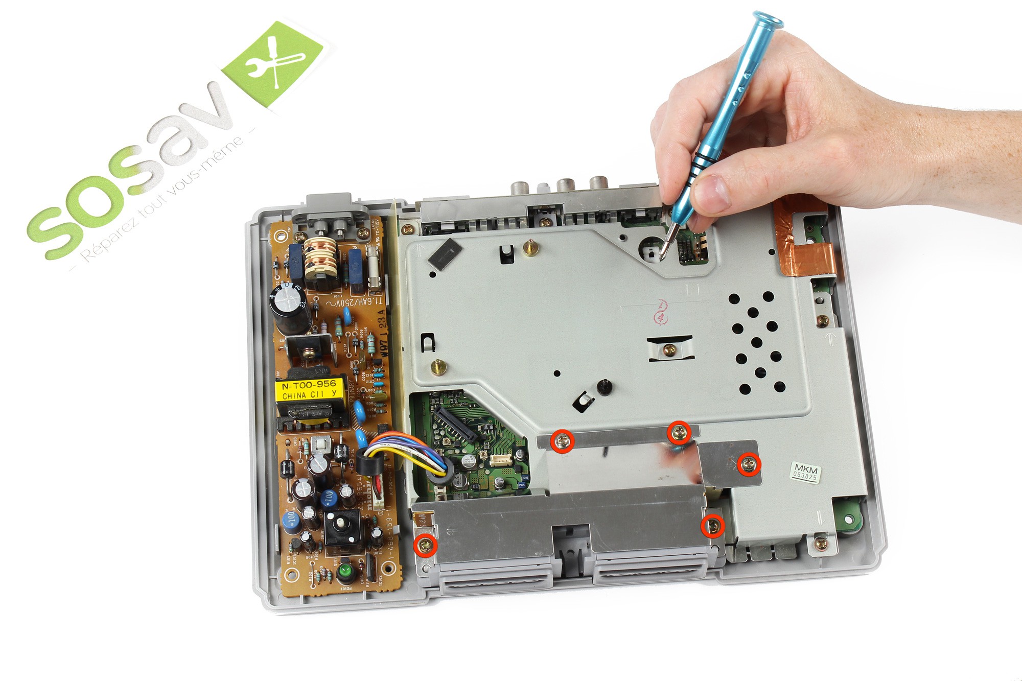 Dévissez les 5 vis cruciformes entourées en rouge.