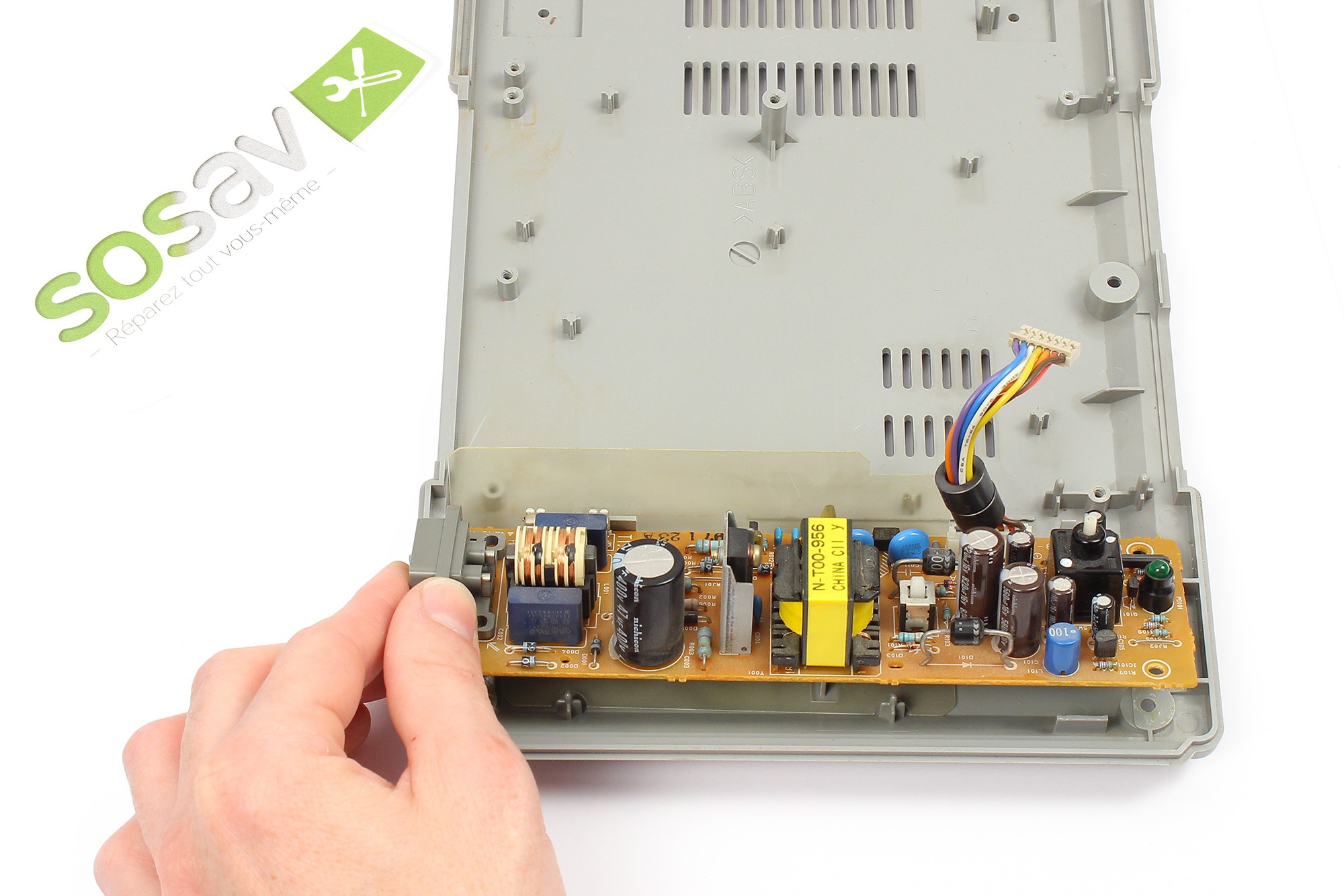Saisissez désormais le câble d'alimentation. Saisissez-le au plus proche de son connecteur situé sur la carte d'alimentation.