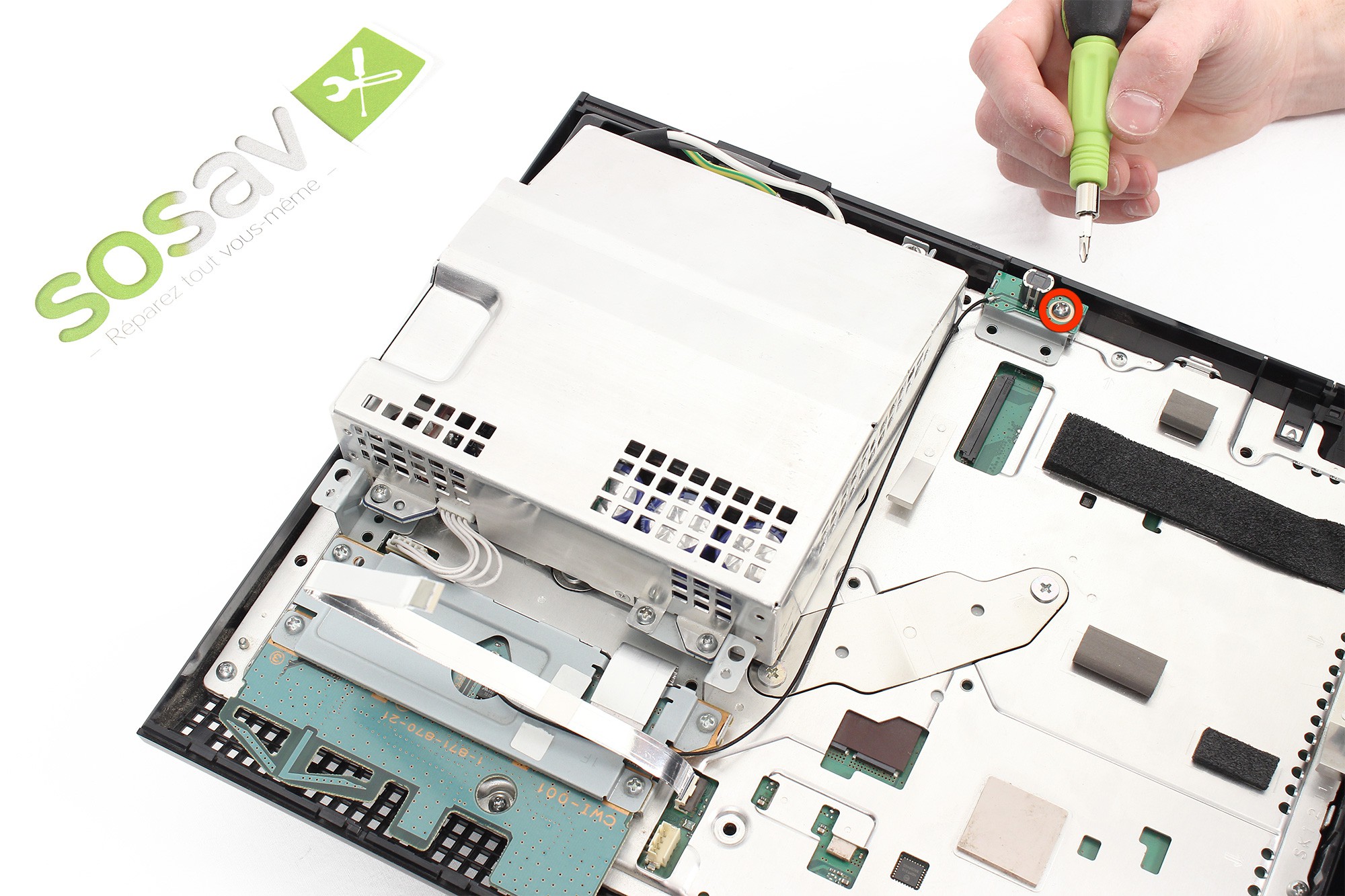 Dévissez la vis cruciforme entourée en rouge sur la photo.