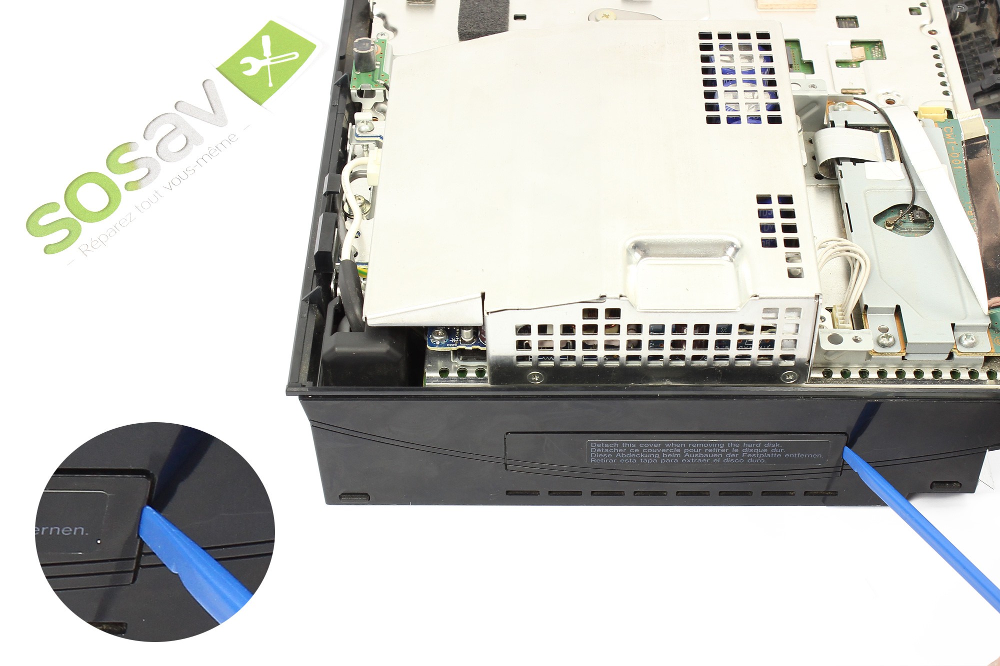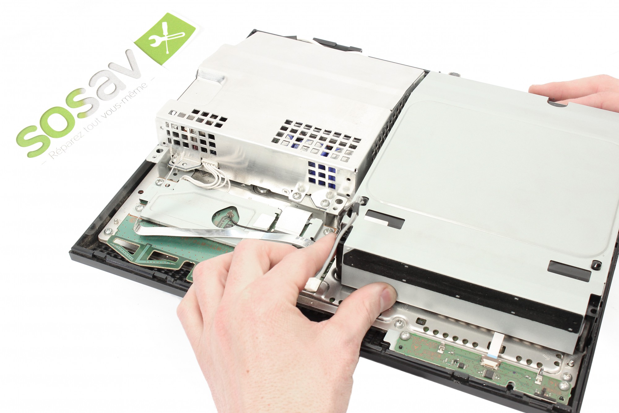 N'essayez pas à ce moment d'ôter totalement le lecteur blu-Ray de votre PS3. Celui-ci est toujours attaché à la PlayStation 3 grâce à une nappe de connexion.