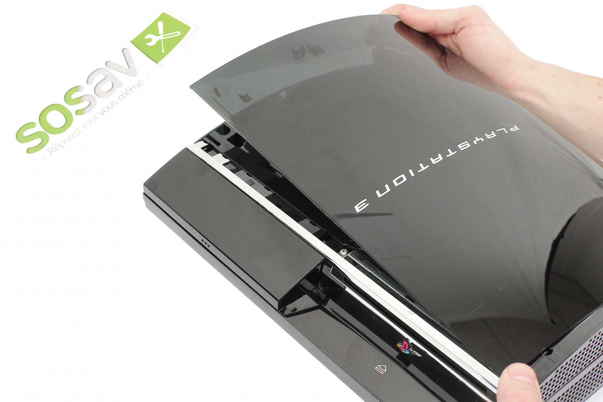 Soulevez désormais le capot supérieur, afin de l'extraire de la PlayStation 3.