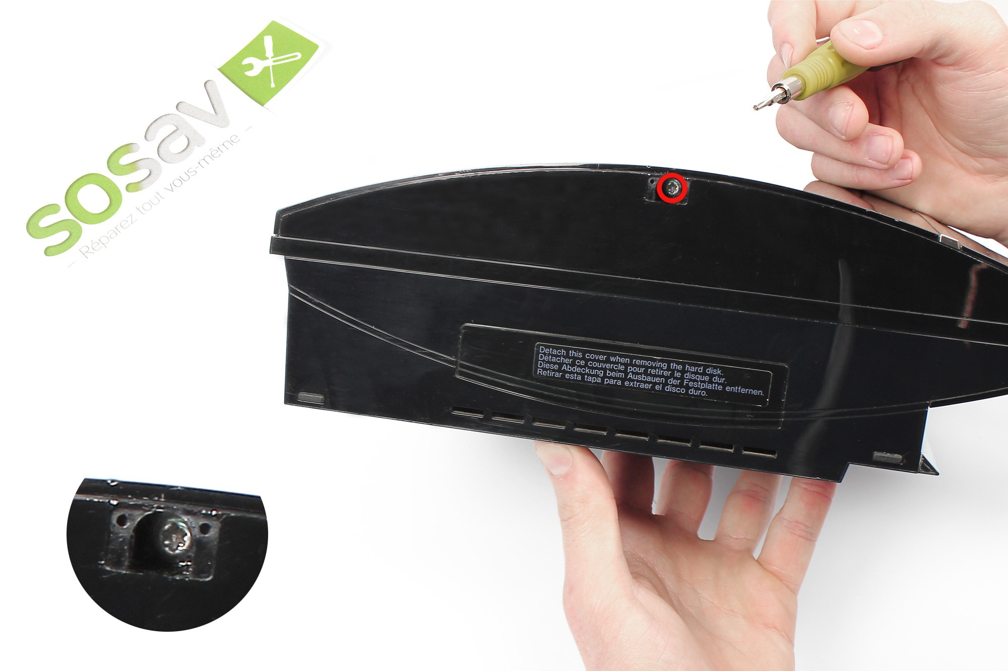 Cette vis entourée en rouge sur la photo retient le capot plastique de protection de votre console.