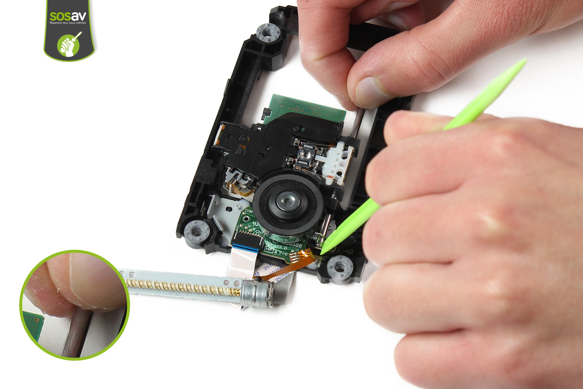 Aidez-vous de la spatule en nylon pour exercer une force vers le haut sur l'élément cylindrique / rail métallique de la lentille.Tout en repoussant cet élément, sortez délicatement le rail du bloc optique.