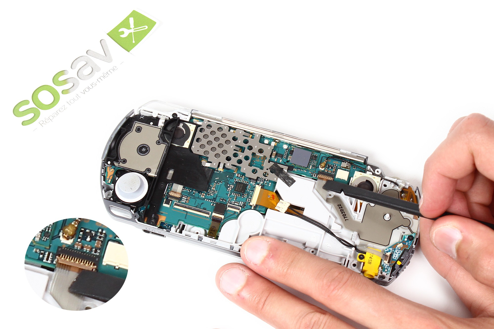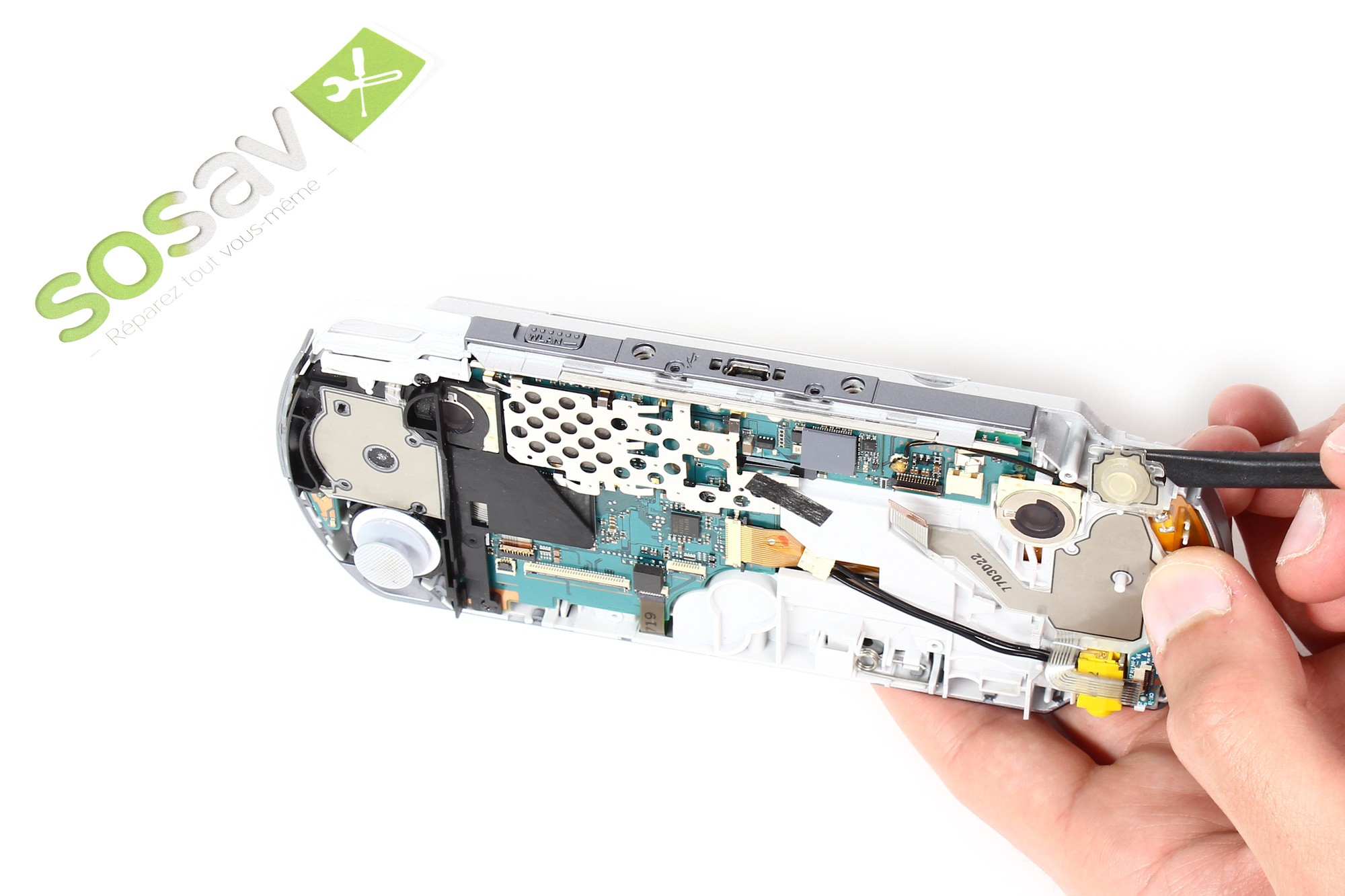 Insérez désormais une spatule en nylon entre la partie supérieure de la nappe R (bouton poussoir du bouton R) et la coque de la PSP 2000.