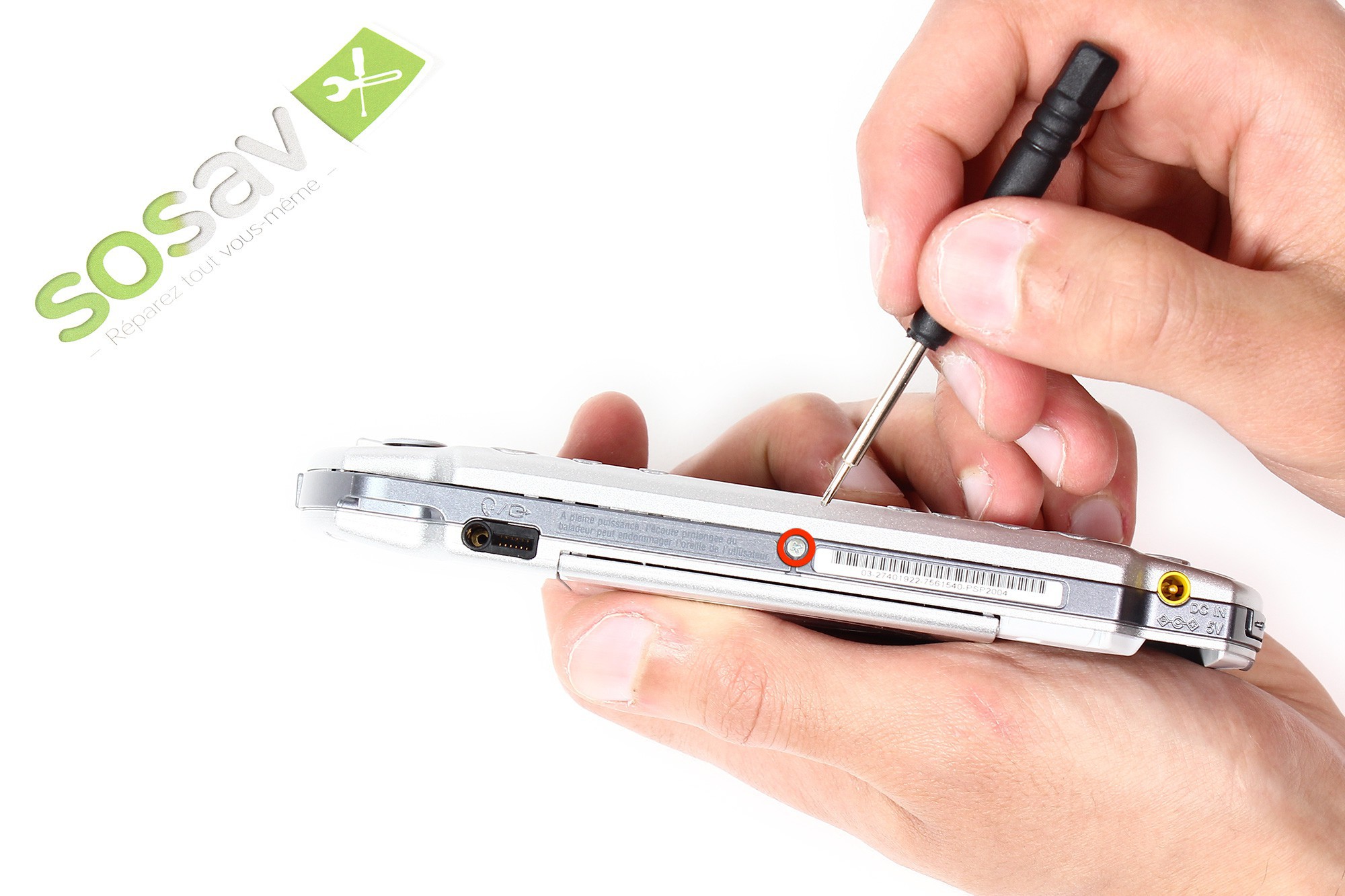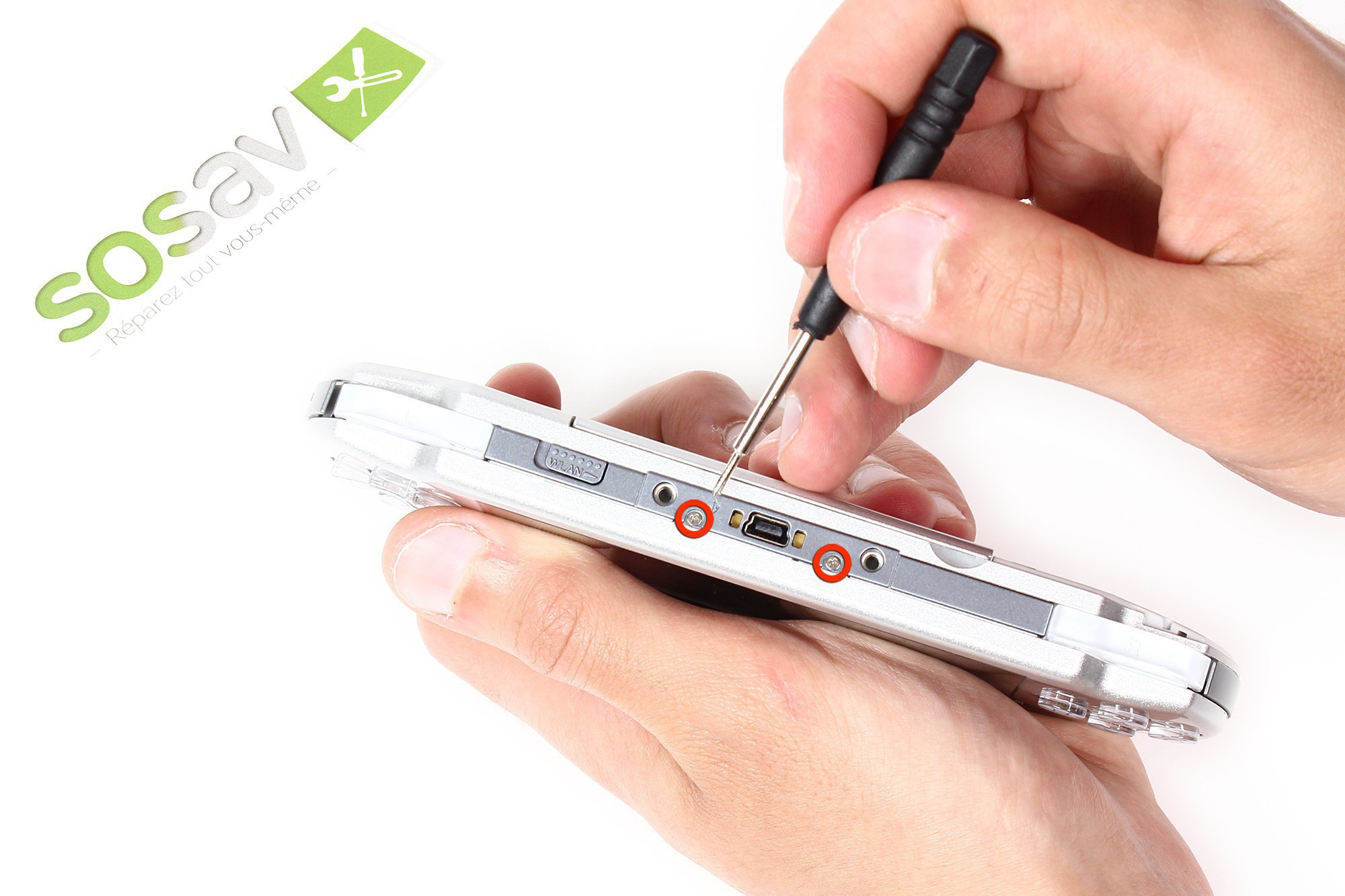 Ces 2 vis sont légèrement plus petites que la vis située sur la tranche inférieure. Veillez bien à ne pas le mélanger afin de faciliter le remontage de votre PSP 2000.