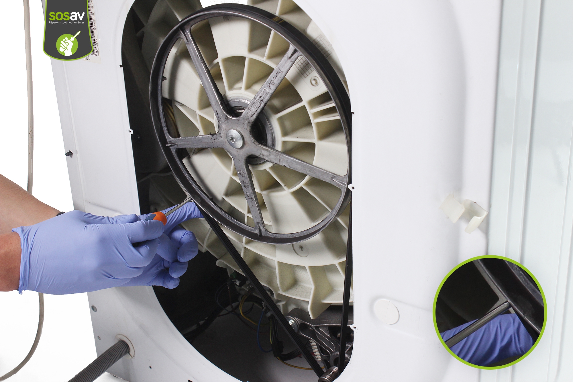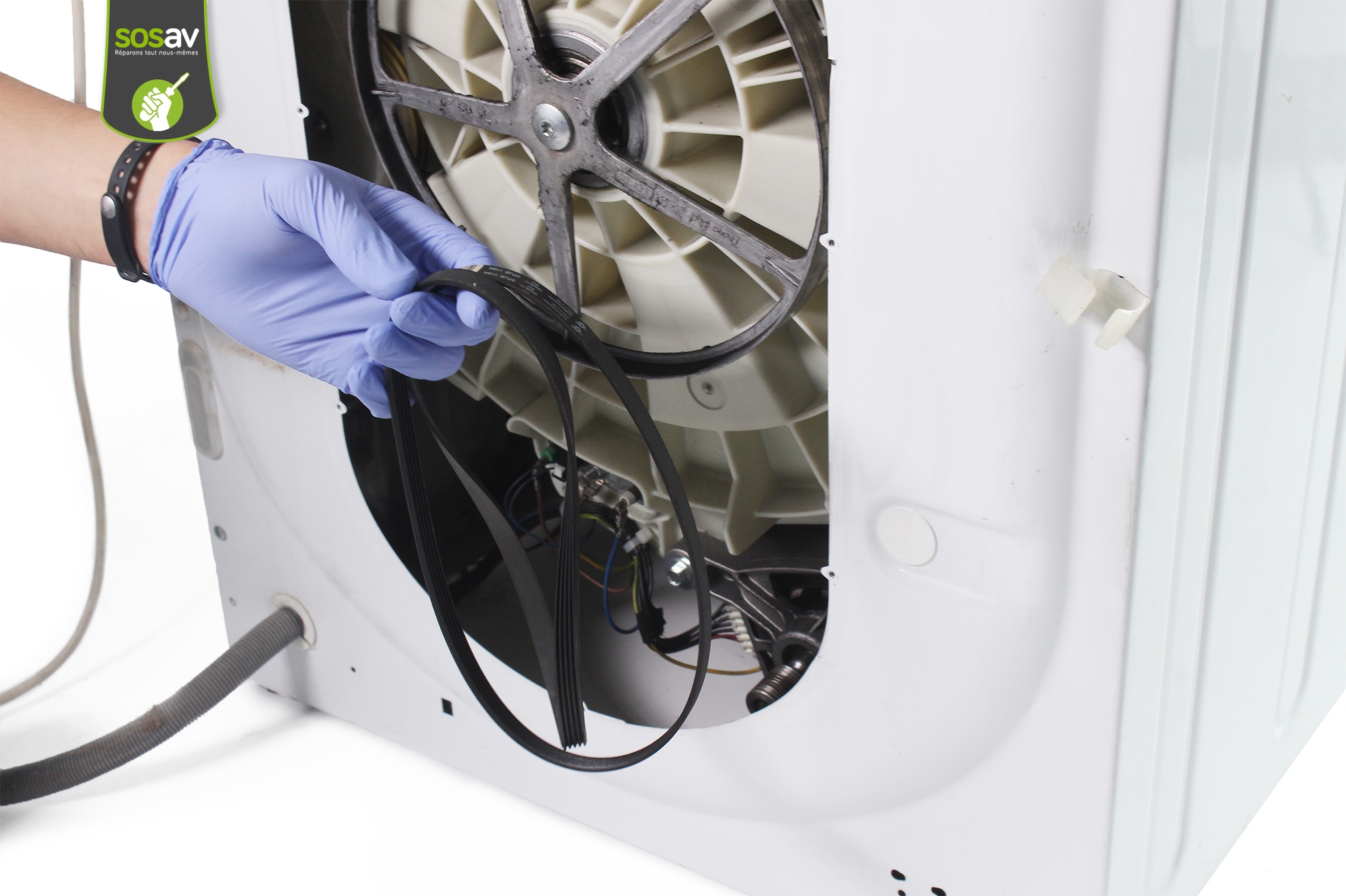 Votre machine à laver est de plus en plus bruyante quand elle est en route ? Il y a des bruits bizarres lorsqu'elle tourne ? L'essorage est particulièrement assourdissant et vous devinez qu'un problème est présent. Si la courroie de votre machine à laver est cassée ou à changer, vous trouverez tous les conseils nécessaires pour y parvenir vous-même à moindre frais grâce à ce guide de réparation illustré et commenté que les techniciens de SOSav ont réalisé pour vous donner un coup de main.
