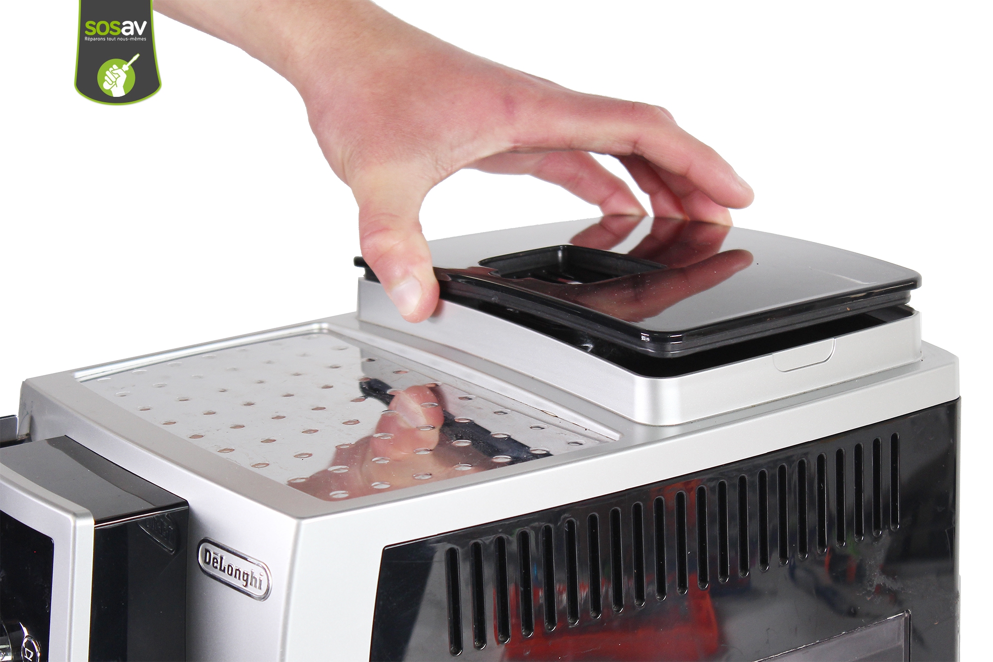 Vous ne pouvez plus mettre vos grains de café dans le réservoir dédié car le capot supérieur de votre machine à café Delonghi ECAM 23.420.SB est cassé ? Vous ne savez pas comment faire pour le retirer ? Pas de problème, que des solutions avec SOSav ! Nos experts vous montrent la marche à suivre dans ce guide de réparation illustré et commenté pour le démonter aisément en moins de 5 minutes.