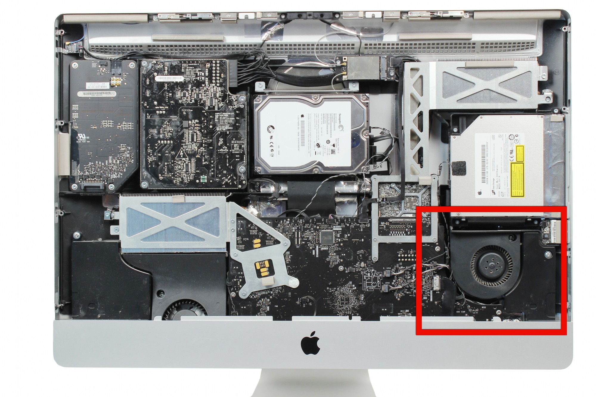 Le lecteur de carte SD est localisé en bas à droite de l'iMac, entre le lecteur optique et le ventilateur du lecteur optique (SuperDrive).