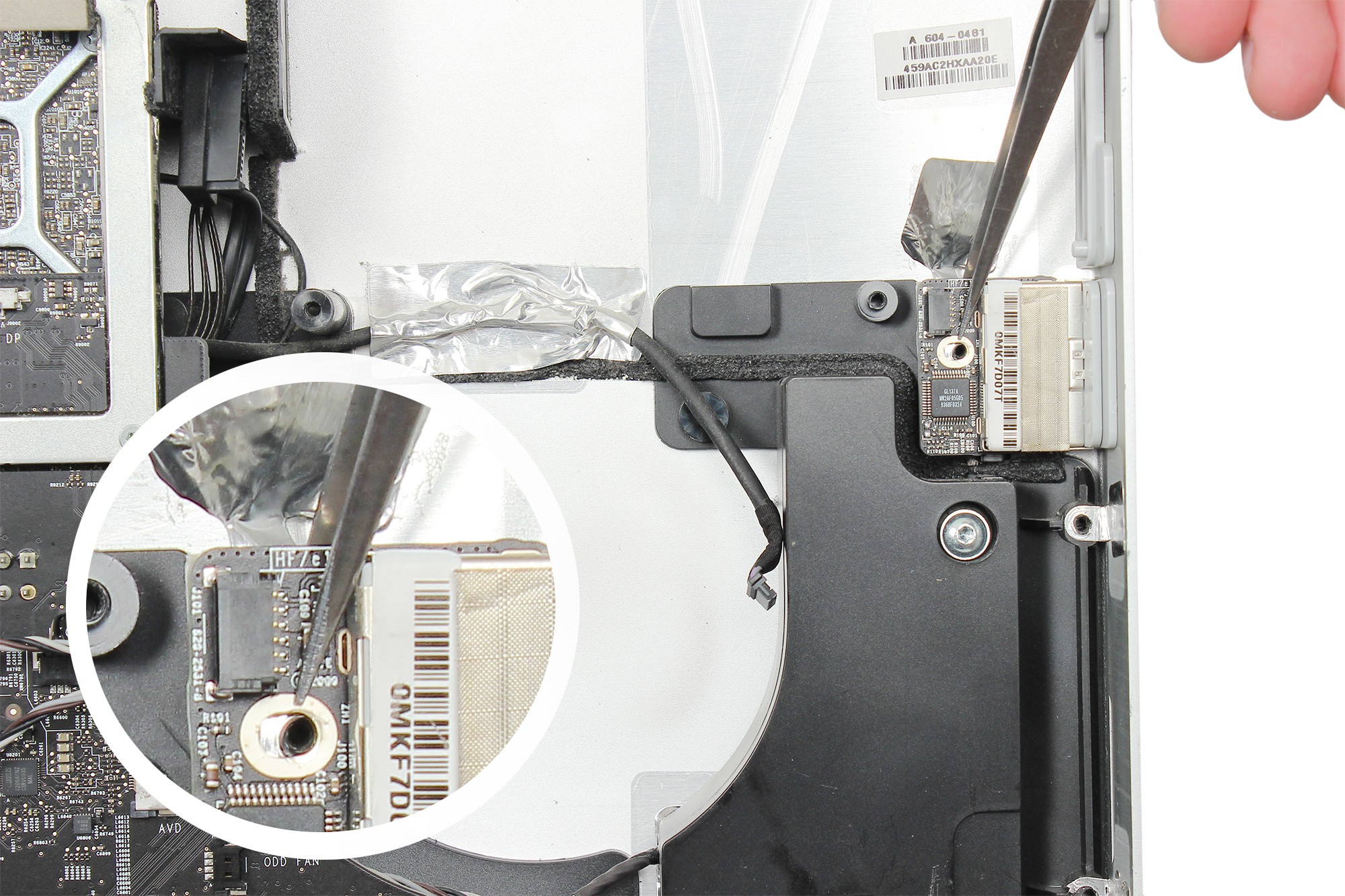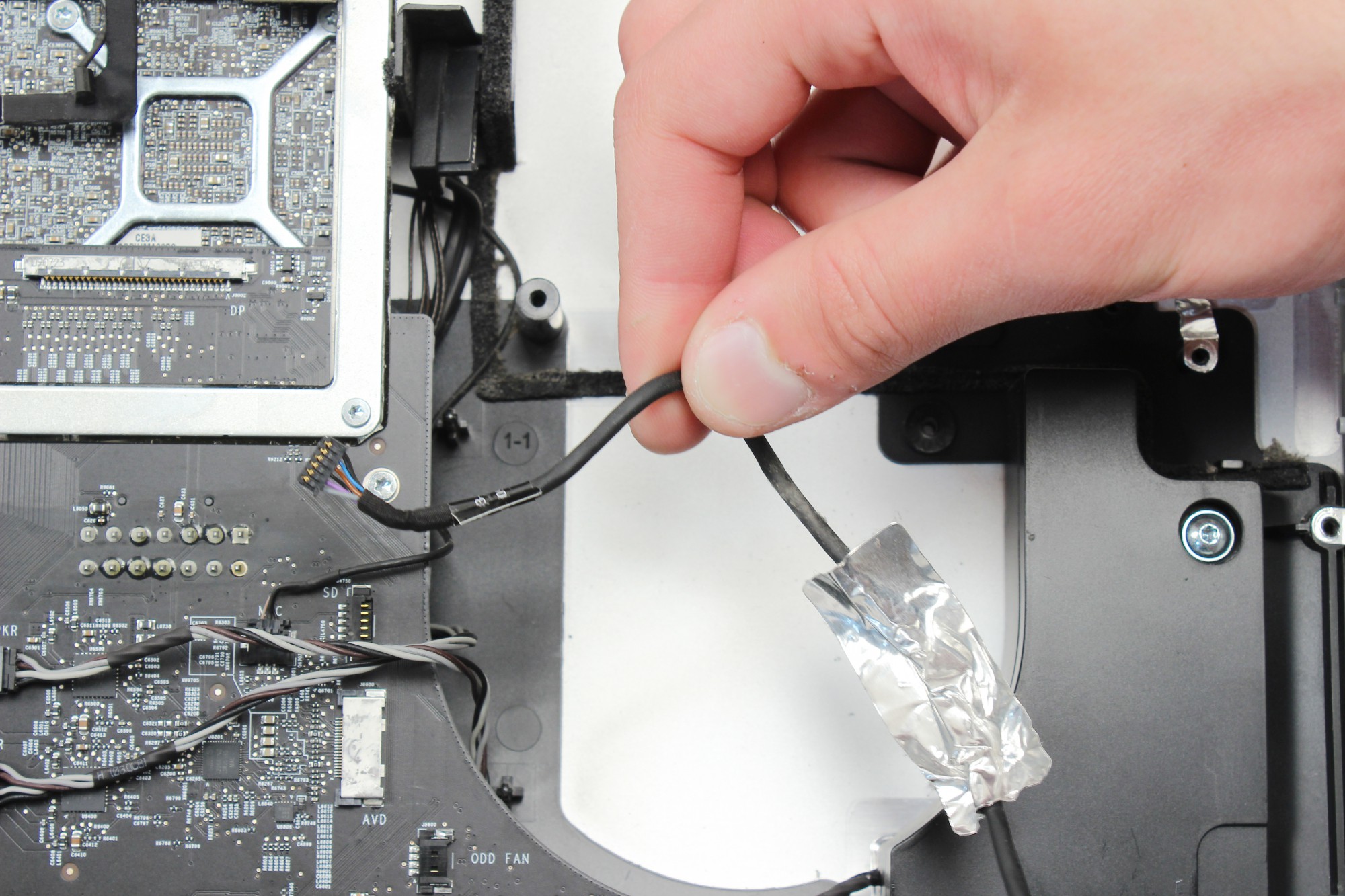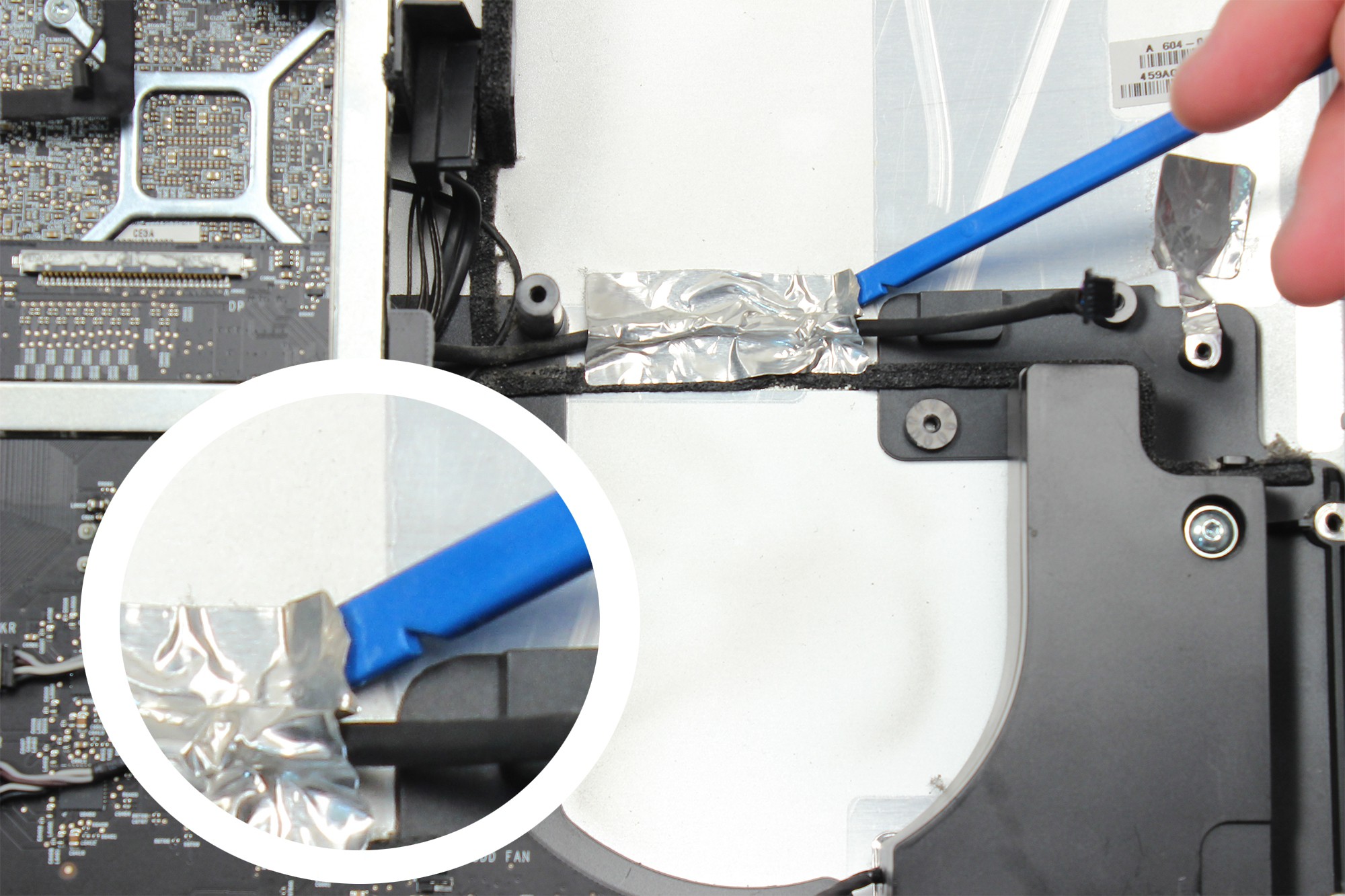 A l'aide d'une spatule en nylon, retirez l'adhésif métallique maintenant le câble au châssis de l'iMac.
