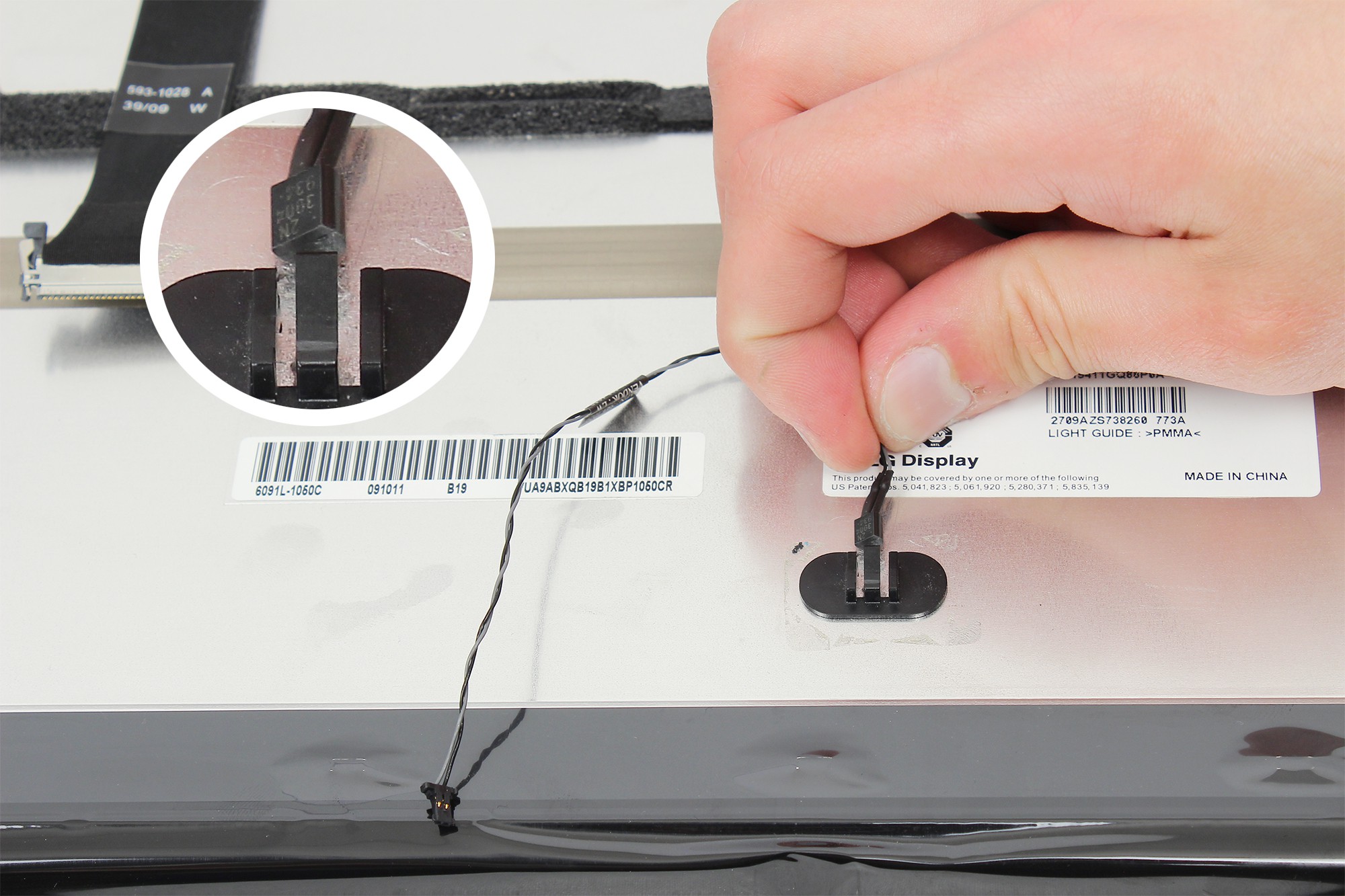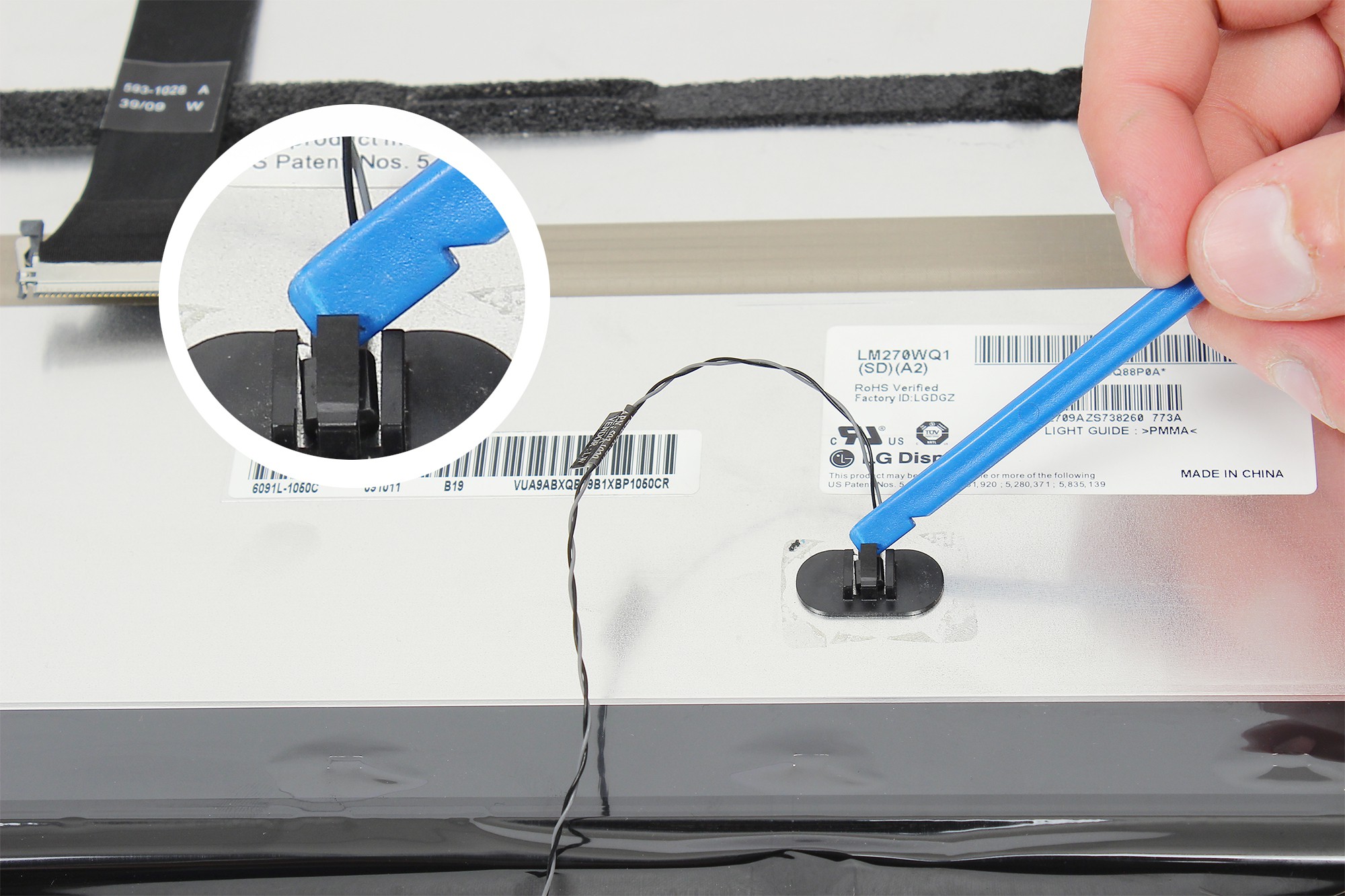 Appuyez légèrement sur le câble noir d'alimentation de l'écran LCD afin de le déclipser.