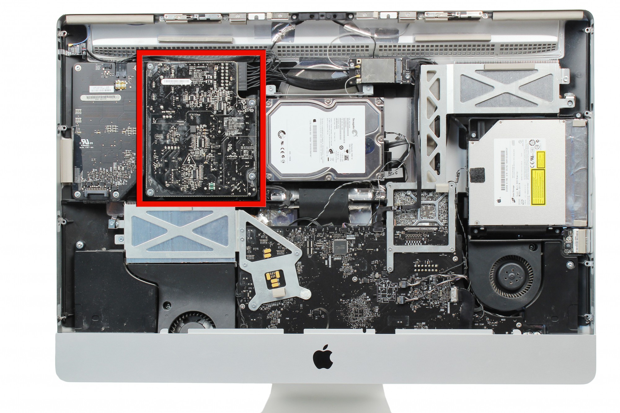 La carte mère de l'iMac est localisée au centre bas droit comme indiqué sur la photo.