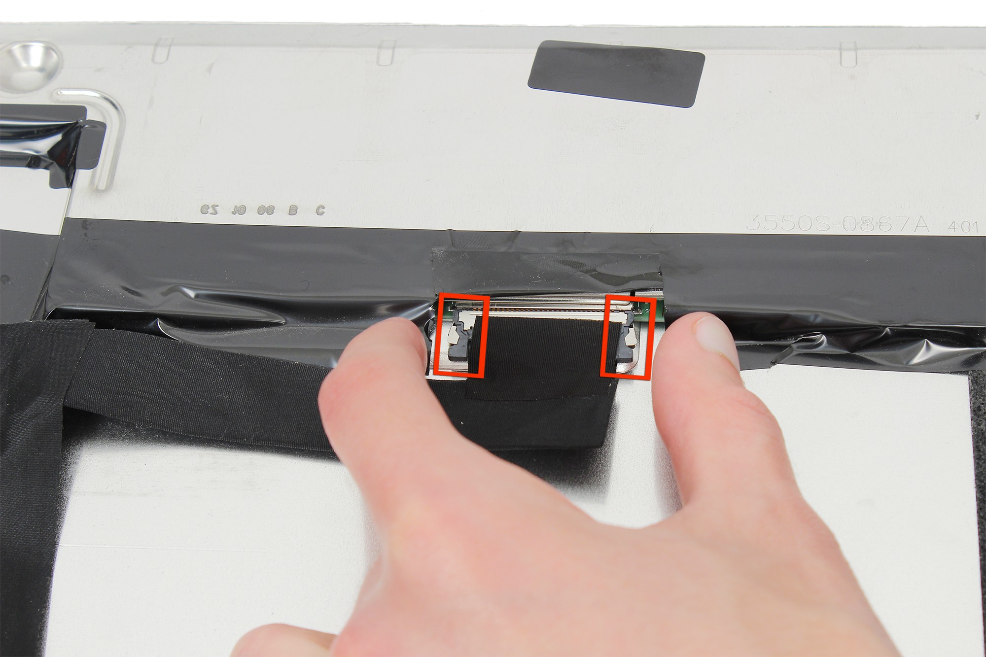 Faites pression sur les deux côtés du connecteur du câble de données de l'écran LCD pour le déverrouiller.
