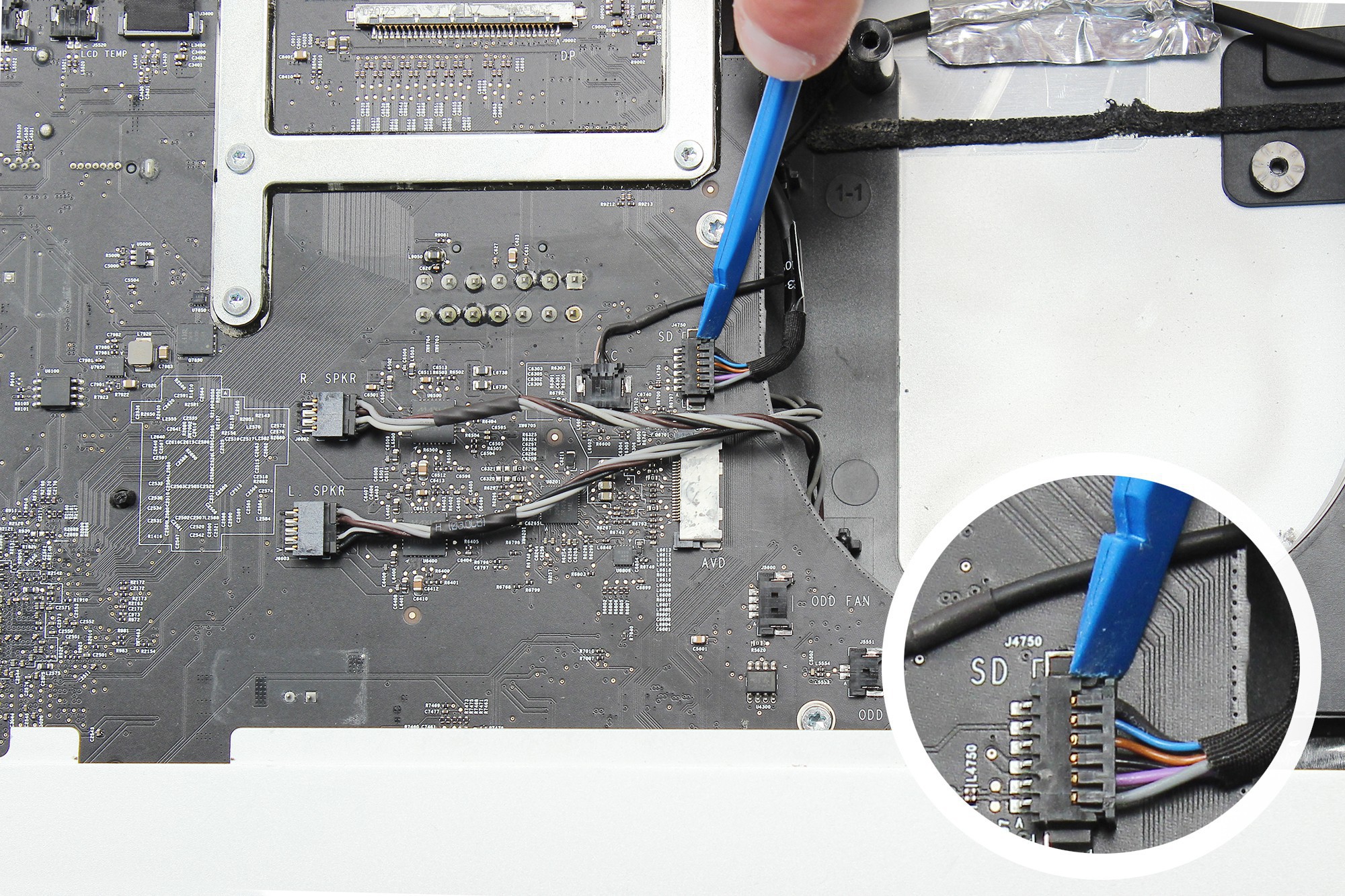 A l'aide d'une spatule en nylon, déconnectez le câble de données et d'alimentation du lecteur de carte SD.