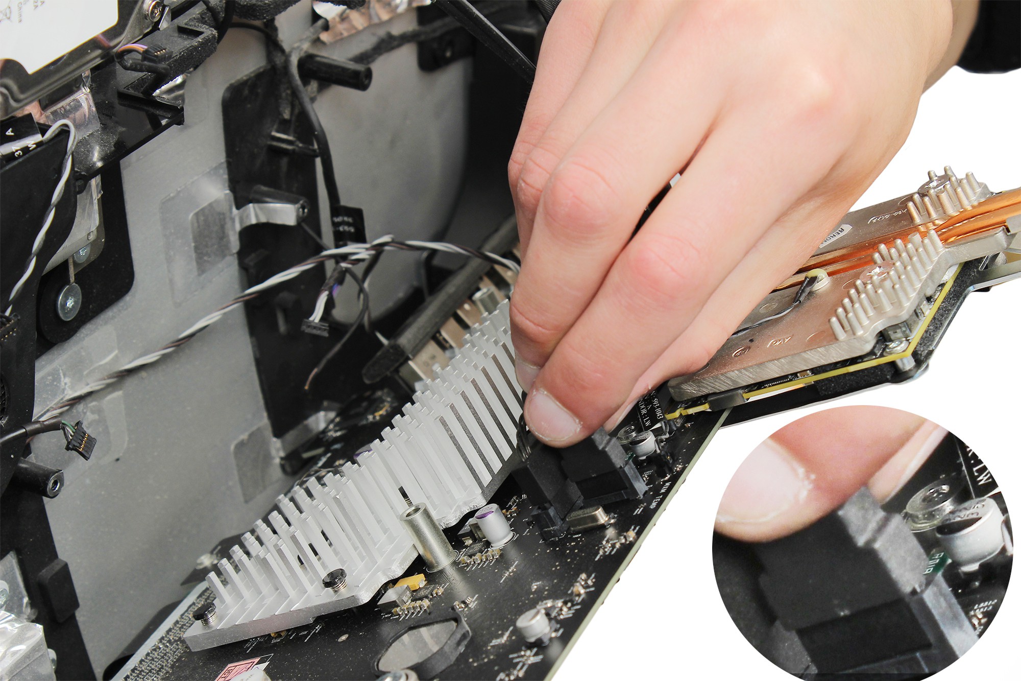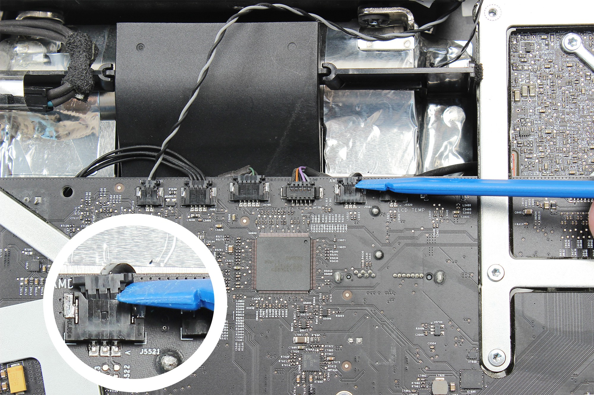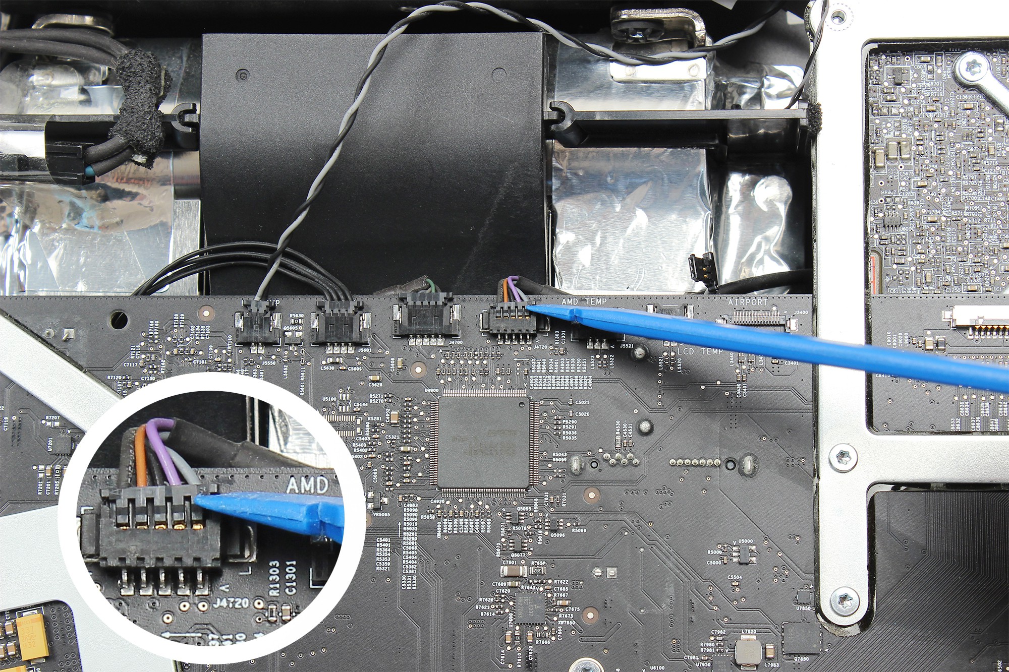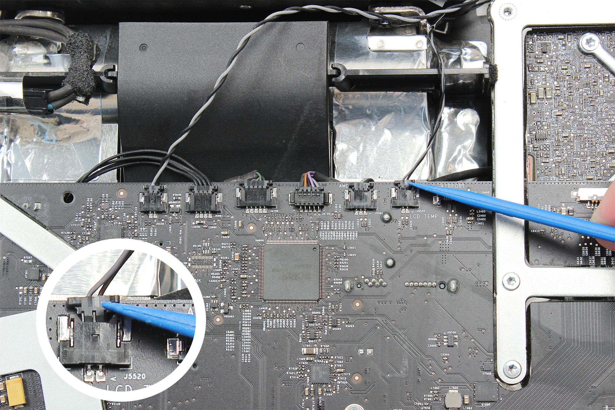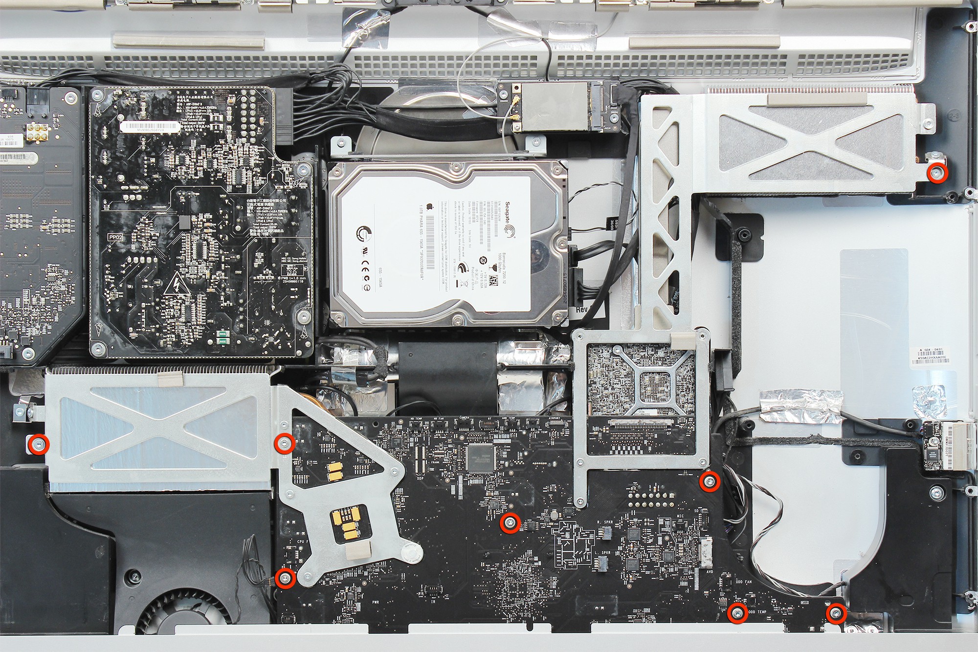 La carte mère de l'iMac est localisée au centre droit, comme indiqué sur la photo.