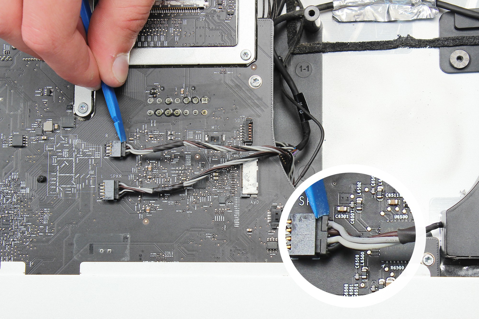 A l'aide de la spatule en nylon, déconnectez la nappe des connecteurs audio.